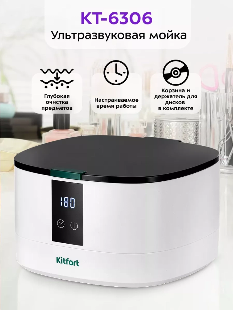 Ультразвуковая мойка Kitfort КТ-6306 поможет эффективно очистить и продезинфицировать небольшие изделия из металла, пластика и стекла. Ультразвуковая очистка — способ очистки поверхности твёрдых тел в жидкости, при котором в жидкость вводятся ультразвуковые колебания. Применение ультразвука значительно ускоряет процесс очистки и повышает качество очистки. В качестве жидкости в ультразвуковой мойке можно использовать воду, а также чистящие или дезинфицирующие растворы.