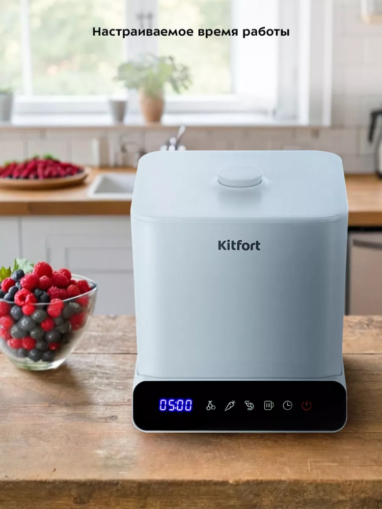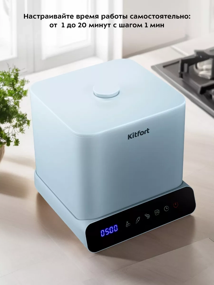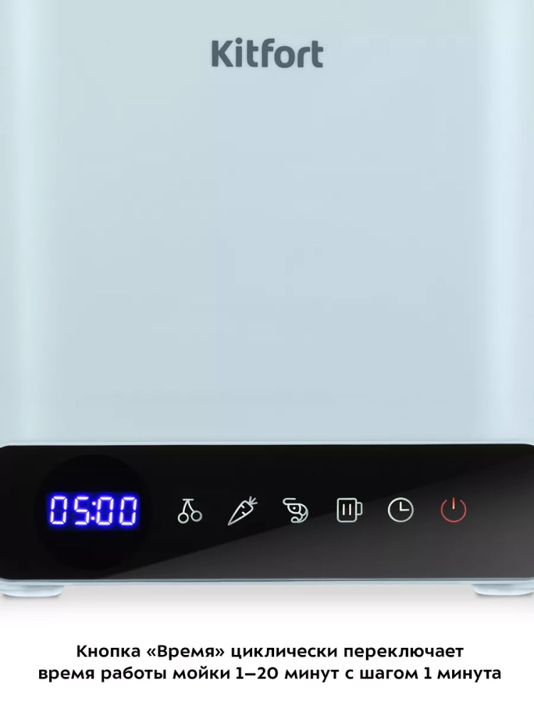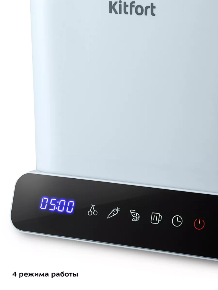 Управление прибором осуществляется при помощи сенсорных кнопок на панели управления. Вы можете выбрать один из 4 режимов. У каждого режима есть предустановленное время работы: 8 минут для фруктов и ягод, 5 минут для овощей, 6 минут для морепродуктов и 15 минут для посуды. Вы можете настроить время работы 1–20 минут с шагом 1 минута. Во время работы на дисплее отображается оставшееся время работы.