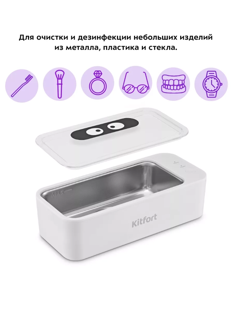 Ультразвуковая мойка Kitfort КТ-6263 поможет эффективно очистить и продезинфицировать небольшие изделия из металла, пластика и стекла. Ультразвуковая очистка — способ очистки поверхности твёрдых тел в жидкости, при котором в жидкость вводятся ультразвуковые колебания. Применение ультразвука обычно значительно ускоряет процесс очистки и повышает его качество. В качестве жидкости в ультразвуковой мойке можно использовать воду, а также чистящие или дезинфицирующие растворы. В основе работы ультразвуковой мойки лежит кавитация, когда в жидкости за короткий промежуток времени образуются и тут же разрушаются миллионы мелких пузырьков воздуха. Пузырьки лопаются и, таким образом, высвобождается большое количество энергии. Этот процесс происходит вследствие чередования волн низкого и высокого давления под воздействием ультразвука. Воздушные пузырьки, соприкасаясь с поверхностью обрабатываемых предметов, разрываются, создавая множество маленьких ударных волн. Благодаря этому происходит глубокая очистка предметов. Корпус прибора сделан из пластика, а резервуар, в который помещаются предметы для очистки, — из нержавеющей стали. Прозрачная крышка позволит наблюдать за процессом очистки. Благодаря небольшому размеру мойка не займет много места у вас в доме. Управление прибором осуществляется при помощи одной кнопки на панели управления. Вы можете выбрать время работы 3 или 6 минут, после которого мойка автоматически отключается. Главное преимущество КТ-6263 — это возможность очищать предметы сложных форм. Еще одним достоинством ультразвуковой мойки КТ-6263 является быстрота процесса при его высокой эффективности. Размер резервуара: 168 х 81 х 41 мм. Длина шнура: 1,2 м