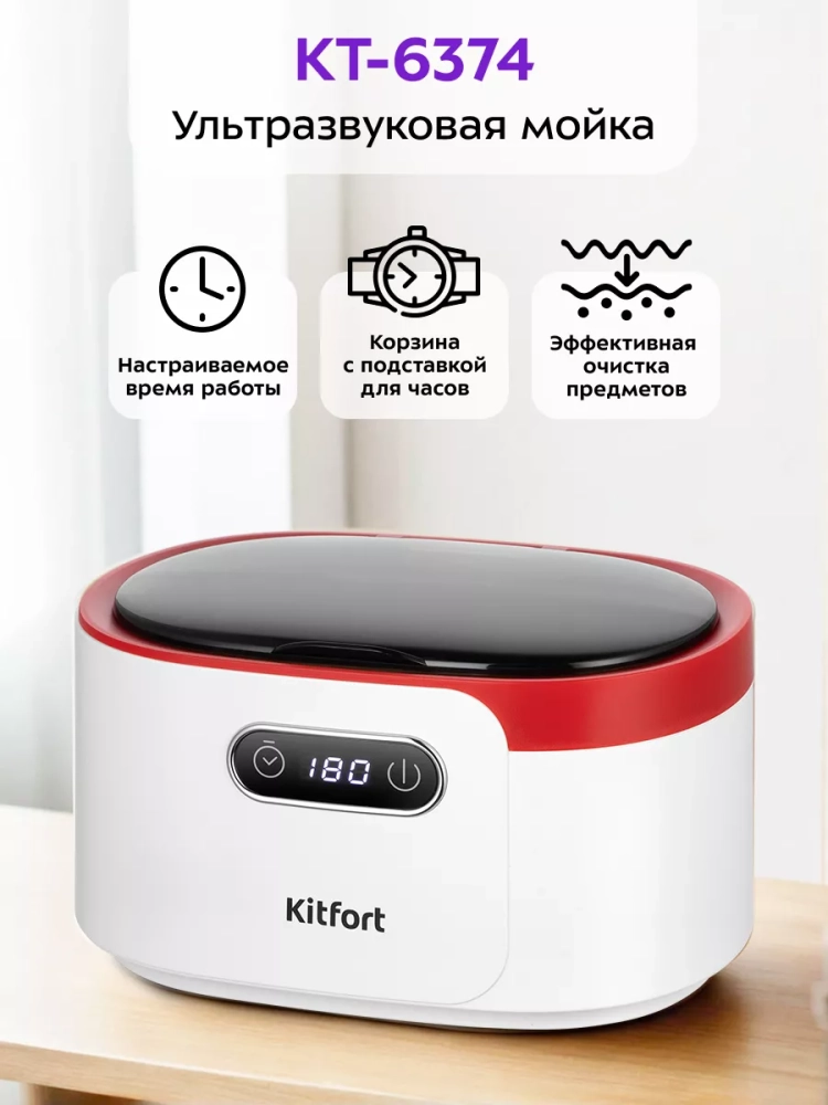Ультразвуковая мойка Kitfort КТ-6374 поможет эффективно очистить и продезинфицировать небольшие изделия из металла, пластика и стекла. Ультразвуковая очистка — способ очистки поверхности твёрдых тел в жидкости, при котором в жидкость вводятся ультразвуковые колебания. Применение ультразвука значительно ускоряет процесс очистки и повышает качество очистки. В качестве жидкости в ультразвуковой мойке можно использовать воду, а также чистящие или дезинфицирующие растворы.