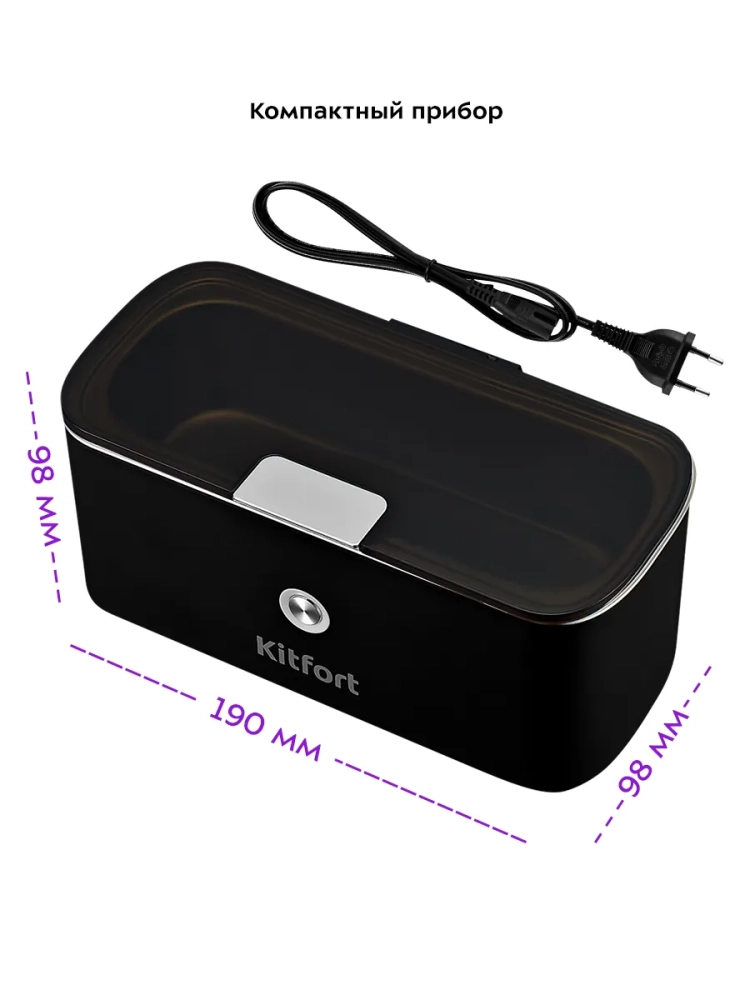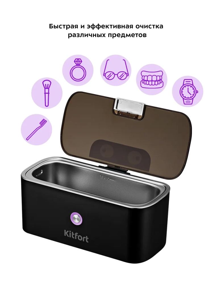 Ультразвуковая мойка Kitfort КТ-2069 поможет эффективно очистить и продезинфицировать небольшие изделия из металла, пластика и стекла, например, маникюрные инструменты, ювелирные украшения. Вам нужно налить воду в мойку и положить в нее изделия, например, золотые украшения, браслет от часов, серьги, зубные протезы, очки и прочее. В основе работы ультразвуковой мойки лежит кавитация, когда в жидкости за короткий промежуток времени образуются и тут же разрушаются миллионы мелких пузырьков воздуха. Пузырьки схлопываются и, таким образом, высвобождается большое количество энергии. Этот процесс происходит вследствие чередования волн низкого и высокого давления под воздействием ультразвука. Воздушные пузырьки, соприкасаясь с поверхностью обрабатываемых предметов, разрываются, создавая множество маленьких ударных волн. Благодаря этому происходит глубокая очистка предметов. Корпус прибора сделан из пластика, а резервуар, в который помещаются предметы для очистки - из нержавеющей стали. Прозрачная пластиковая крышка позволит наблюдать за процессом очистки. Размер мойки всего 19 x 9,8 см, она не займет много места у вас в доме. Управление прибором осуществляется с помощью одной единственной кнопки включения/выключения, при нажатии на которую загорается индикатор работы. Прибор автоматически отключается после 5 минут работы. Главное преимущество КТ-2069 - это возможность очищать предметы сложных форм. Еще одним достоинством ультразвуковой мойки КТ-2069 является быстрота процесса при его высокой эффективности. Мощность 30 Вт. Емкость 300 мл. Длина шнура 0,9 м.