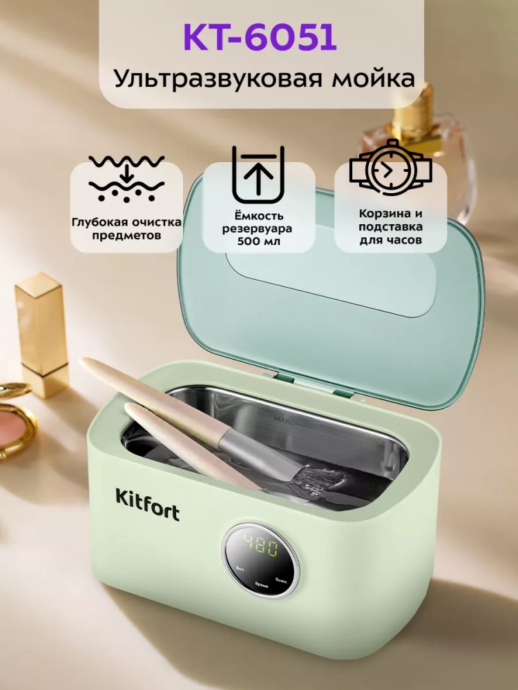 Ультразвуковая мойка Kitfort КТ-6051 поможет эффективно очистить и продезинфицировать небольшие изделия из металла, пластика и стекла. Ультразвуковая очистка — способ очистки поверхности твёрдых тел в жидкости, при котором в жидкость вводятся ультразвуковые колебания. Применение ультразвука значительно ускоряет процесс очистки и повышает качество очистки. В качестве жидкости в ультразвуковой мойке можно использовать воду, а также чистящие или дезинфицирующие растворы.