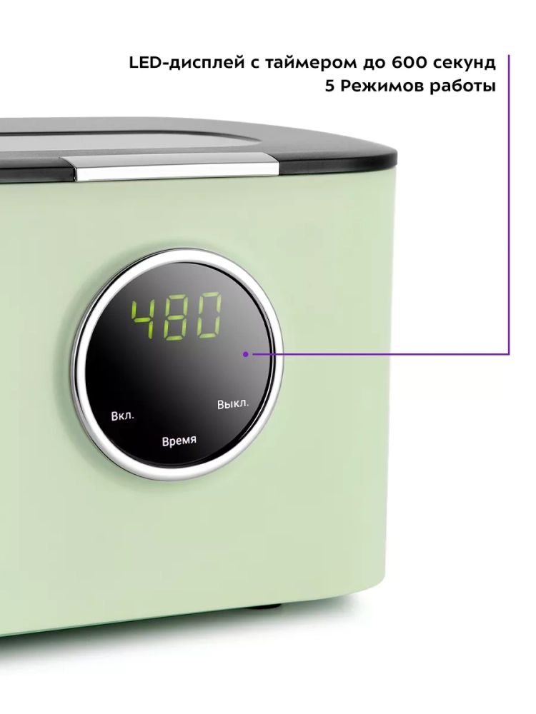 Управление прибором осуществляется при помощи сенсорных кнопок на панели управления. Вы можете выбрать время работы 90, 180, 300, 480 или 600 секунд, после которого мойка автоматически отключается. Во время работы на дисплее отображается оставшееся время работы.