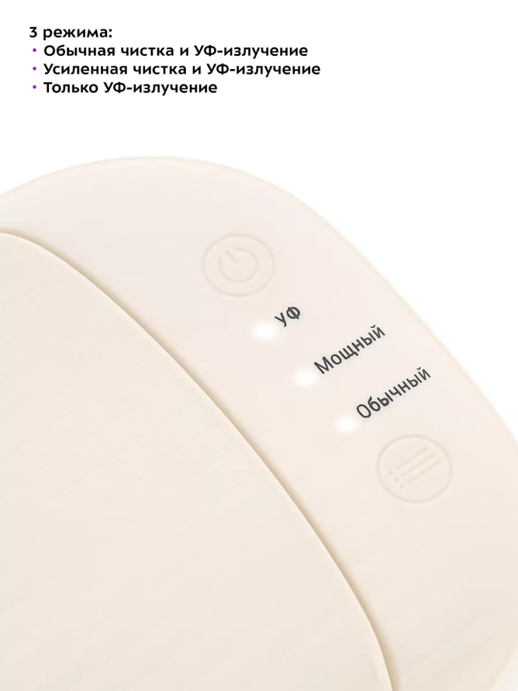 Управление прибором осуществляется при помощи сенсорных кнопок на панели управления. Вы можете выбрать один из 3 режимов работы: нормальная чистка и УФ-излучение, усиленная чистка и УФ-излучение или только УФ-излучение. По прошествии предустановленного времени работы режима мойка автоматически отключается.