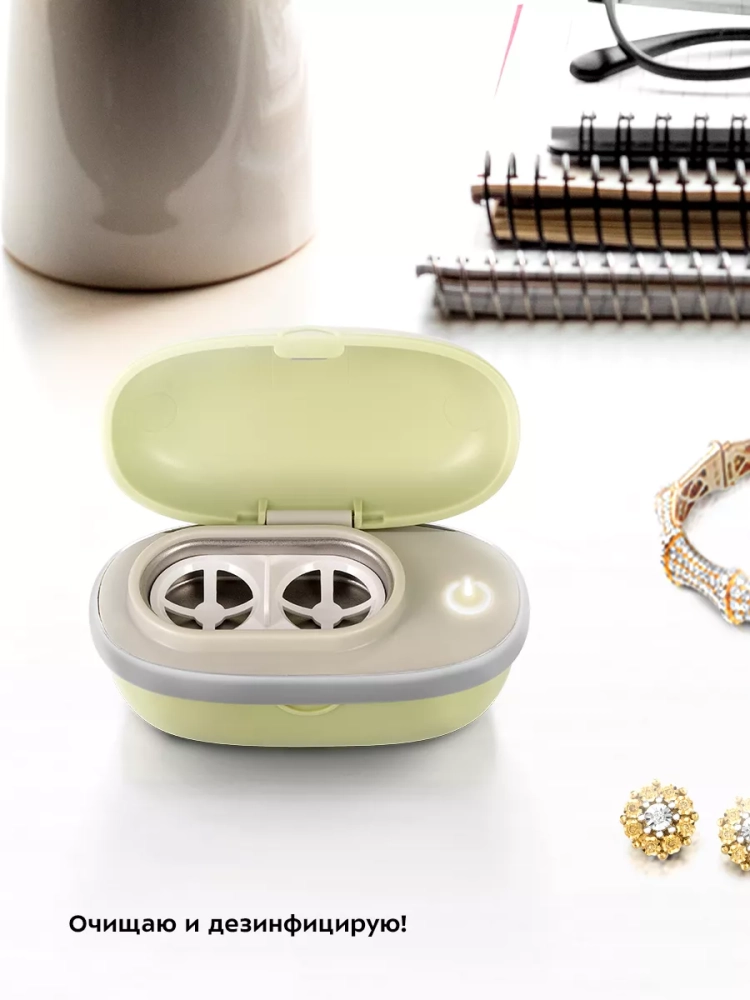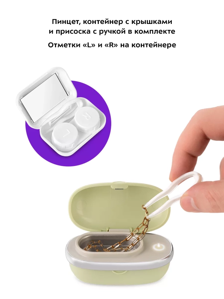 Корпус прибора сделан из пластика, а резервуар, в который помещаются линзы для очистки, — из нержавеющей стали. Благодаря небольшому размеру мойка не займет много места у вас в доме.