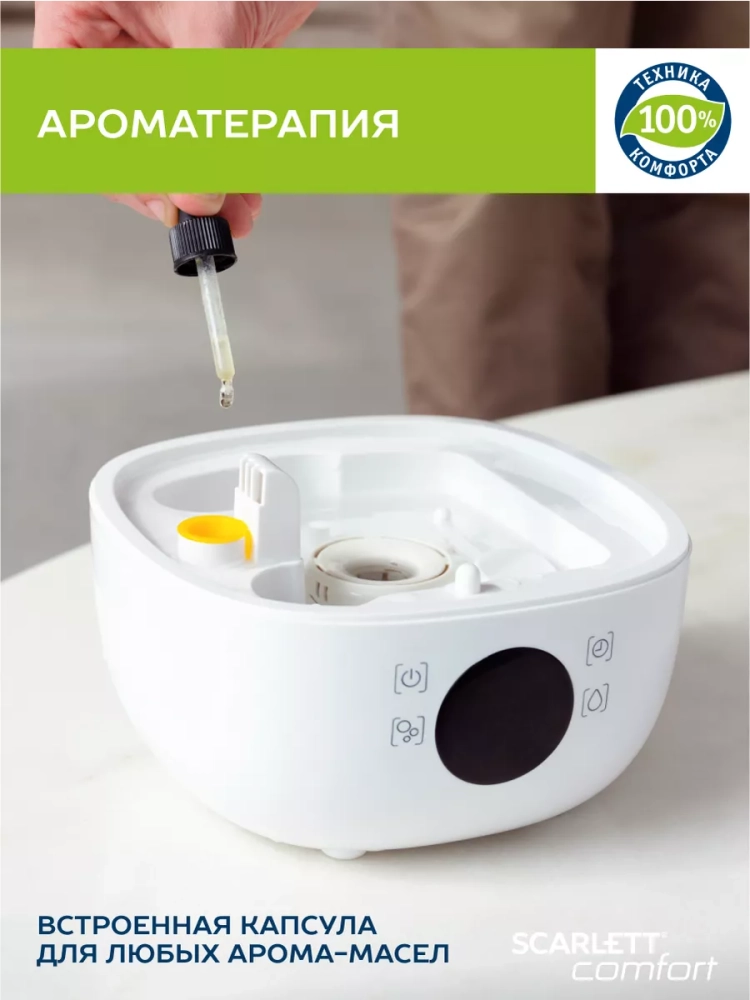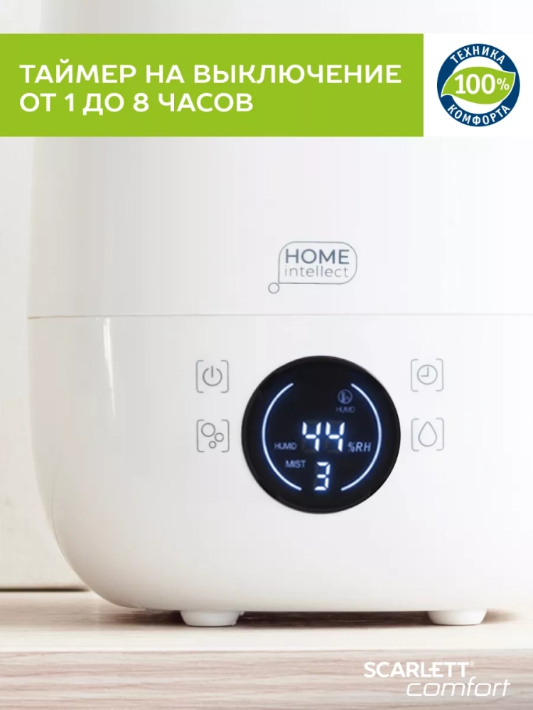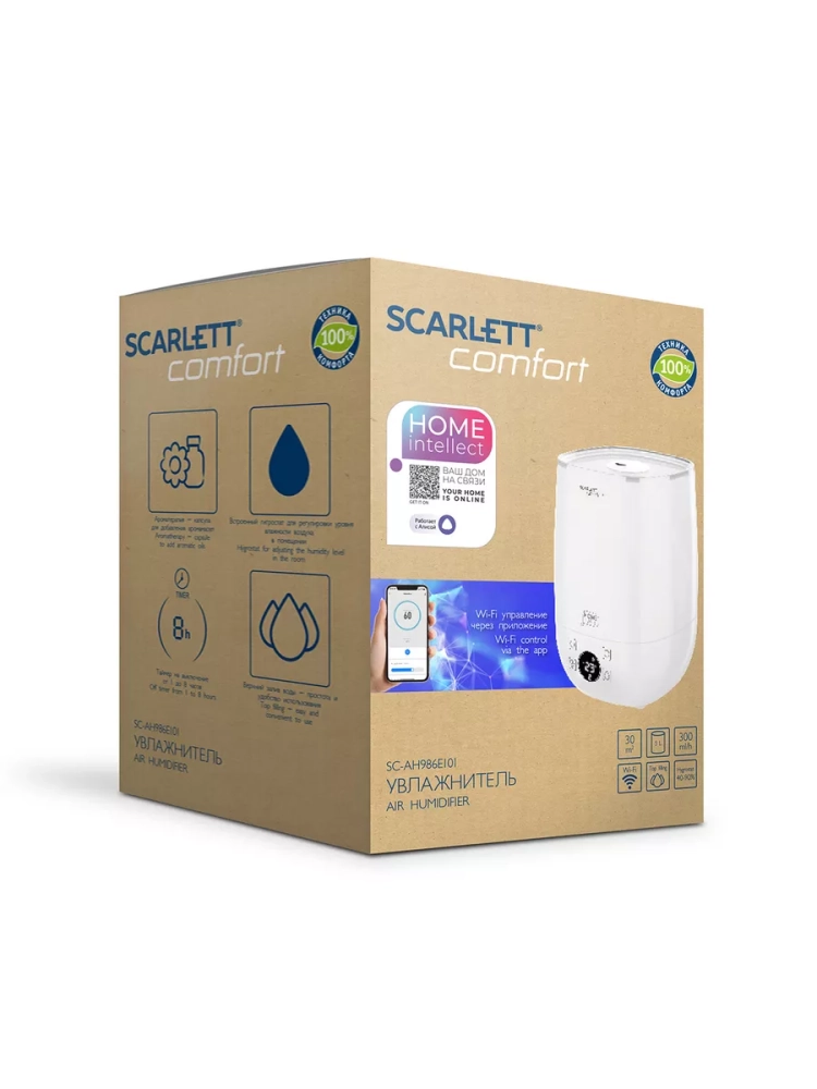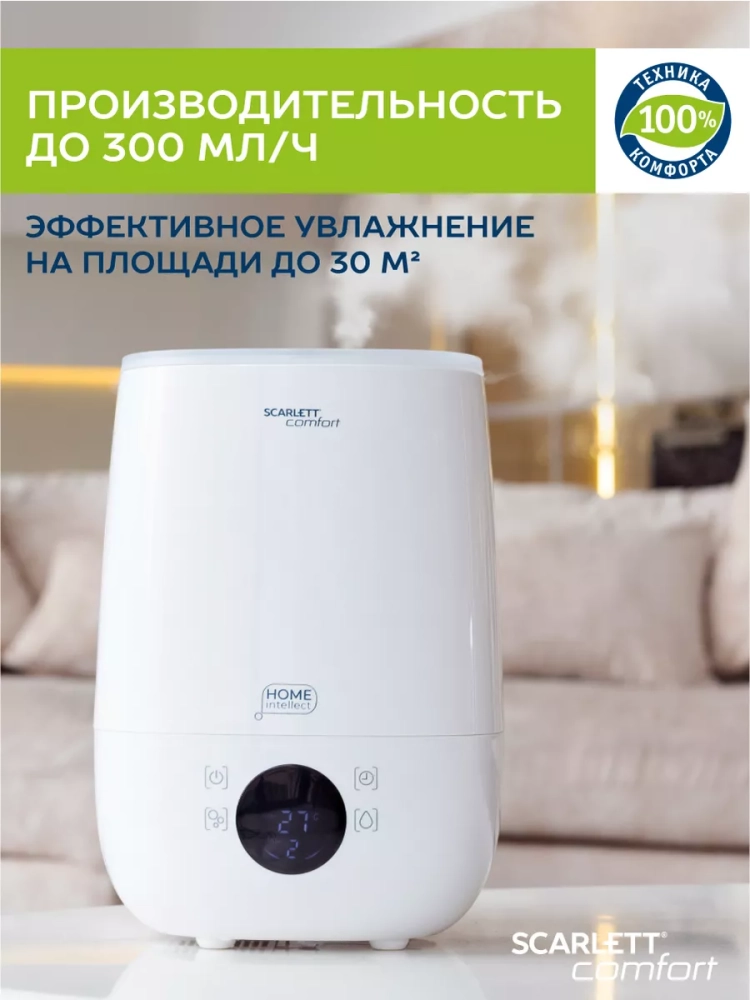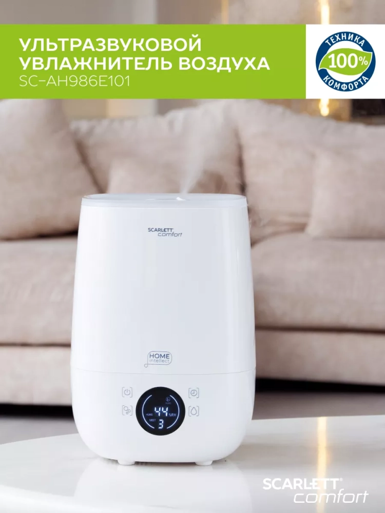 Увлажнитель воздуха SC-AH986E101 оснащен функцией верхнего долива воды для максимально комфортного использования прибора. Нет необходимости доставать резервуар для воды, что позволяет избежать разбрызгивания воды. Резервуар вмещает в себя 5 литра воды, чего достаточно для увлажнения помещения площадью до 30 квадратных метров. Встроенный гигростат дает возможность регулировать влажность воздуха в помещении и отображает на дисплее текущий уровень влажности, что помогает создать оптимальный микроклимат.