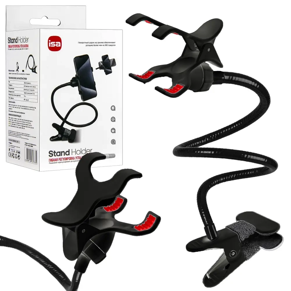 Материал - ABS пластик, металл, силикон Тип крепления - фиксатор для стола до 3 см Тип держателя - гибки, длина штанги 48 см Максимальный хват держателя - 11 см Угол наклона - 360 градусов Вес товара