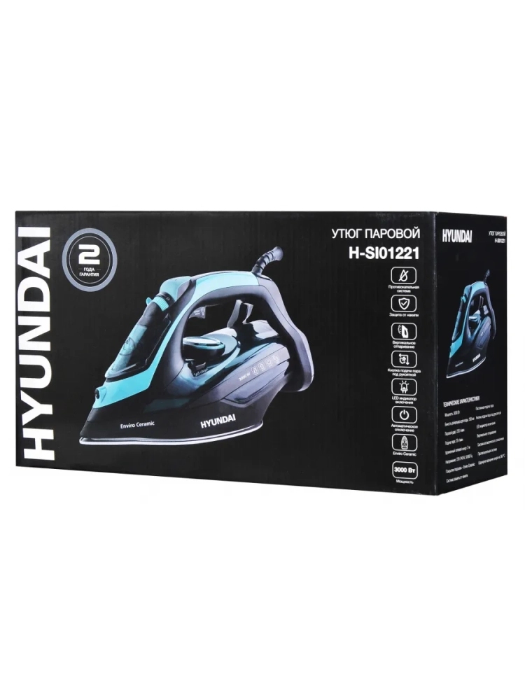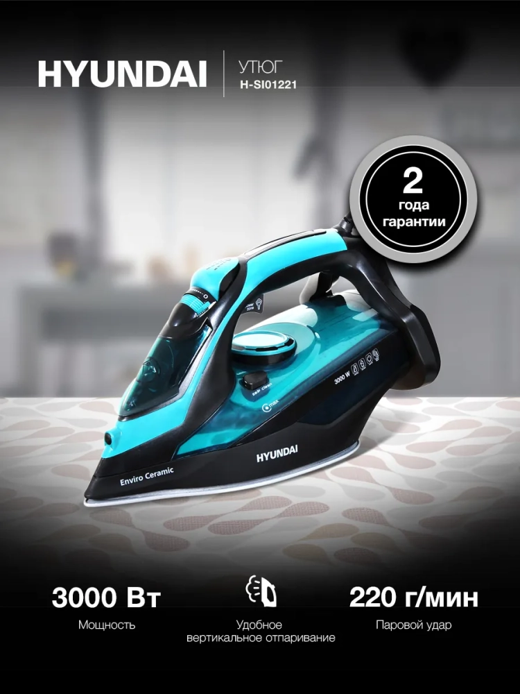 Утюг Hyundai H-SI01221 черный/зеленый, мощность 3000Вт, подошва утюга керамическая Enviro Ceramic, паровой удар 220г, емкость для воды 500мл, длина шнура 3м