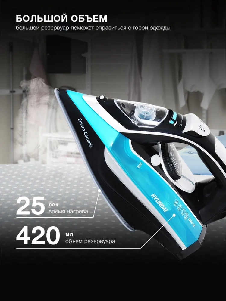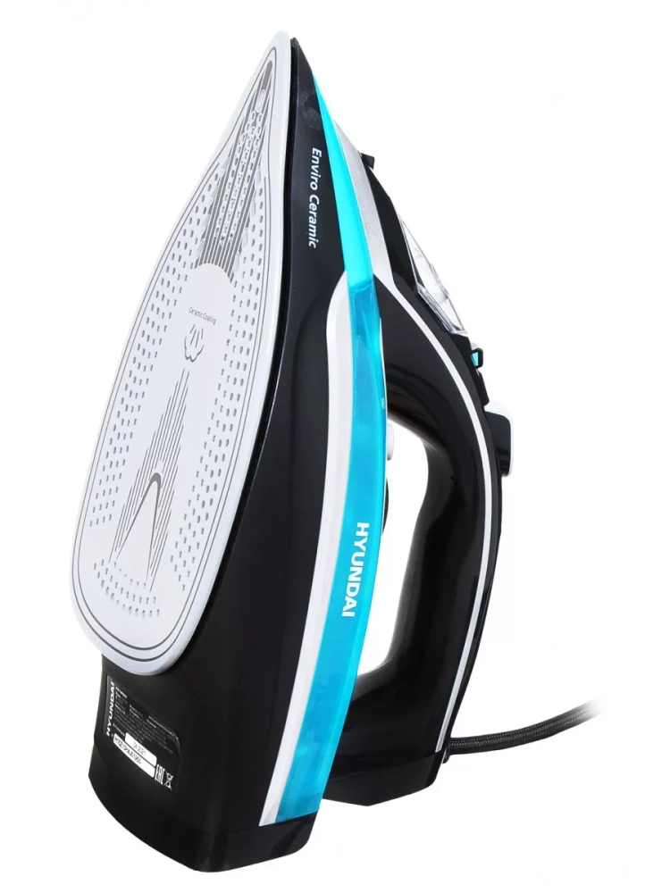 Утюг Hyundai H-SI01336 черный/голубой, мощность 2800Вт, подошва утюга керамическая Enviro Ceramic, паровой удар 200г, емкость для воды 420мл, длина шнура 2м