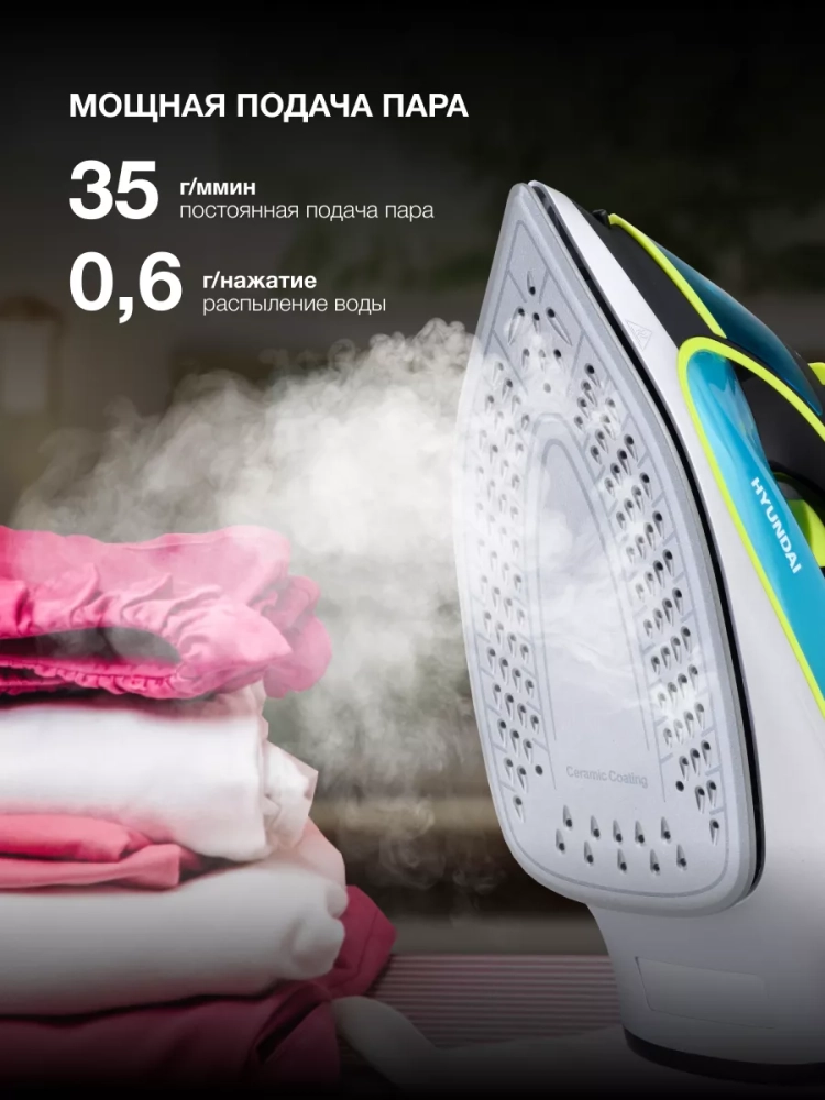 Утюг Hyundai H-SI01450 голубой/желтый, мощность 3200Вт, подошва утюга керамическая Enviro Ceramic, паровой удар 220г, емкость для воды 450мл, длина шнура 2м.