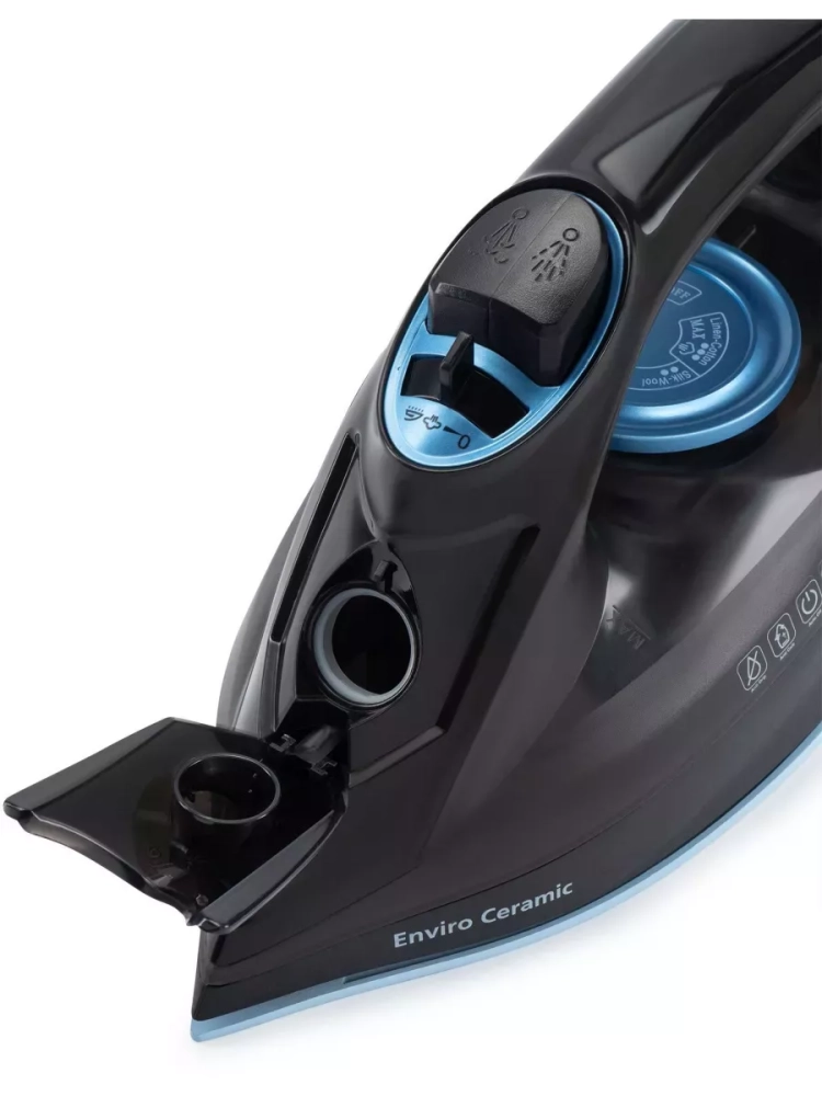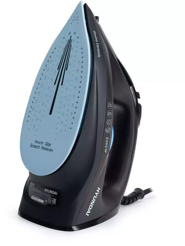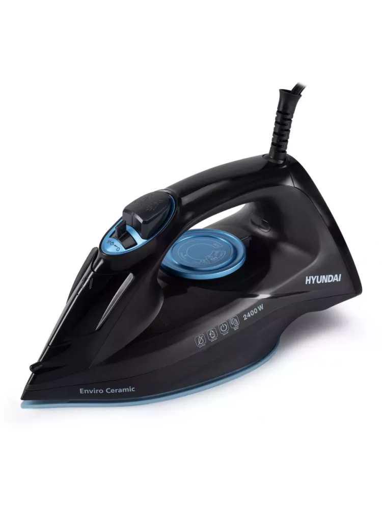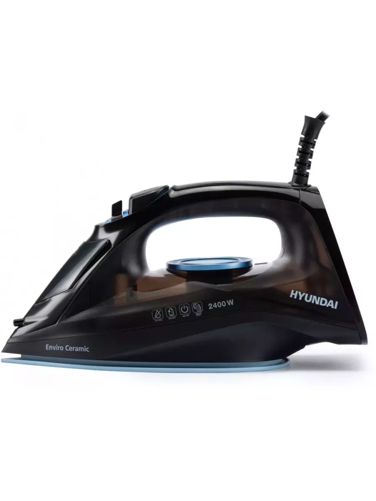 Утюг Hyundai H-SI01557 черный/голубой, мощность 2400Вт, подошва утюга керамическая Enviro Ceramic, паровой удар 160г, емкость для воды 250мл, длина шнура 2м.
