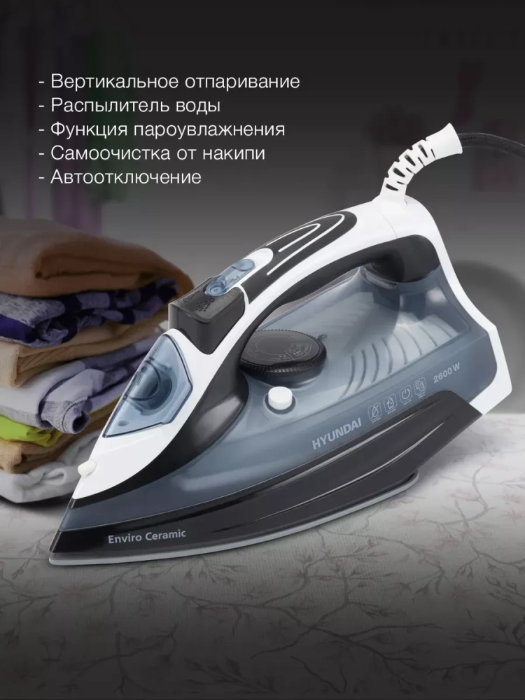 Утюг Hyundai H-SI01573 черный/синий, мощность 2600Вт, подошва утюга керамическая Enviro Ceramic, паровой удар 180г, емкость для воды 300мл, длина шнура 2м.