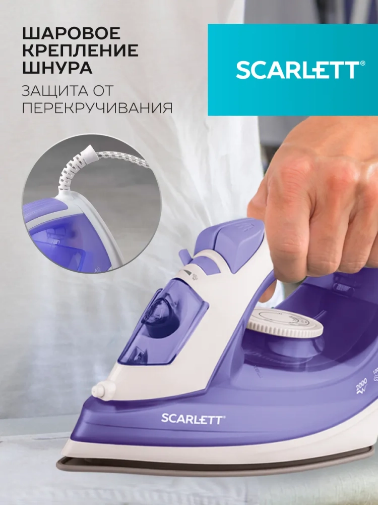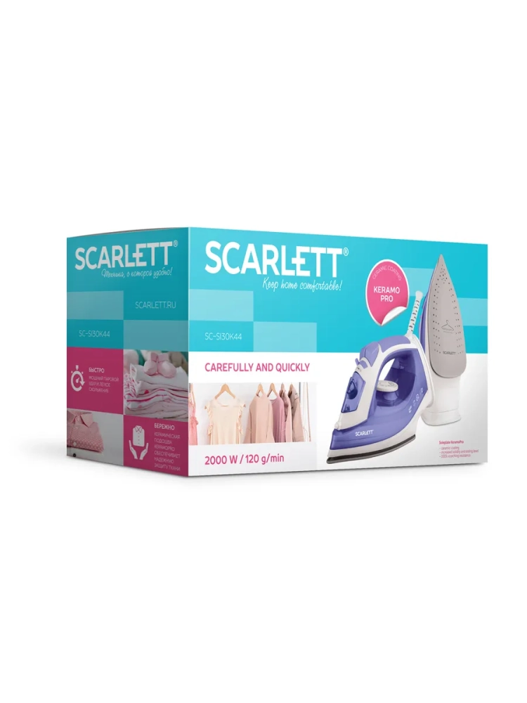 Утюг SC-SI30K44 в нежно лиловом цвете мощностью 2000 Вт оснащена керамической подошвой KeramoPro, которая позаботится о качественной работе прибора. Функция антинакипь обеспечит долгий срок службы утюга. Вертикальное отпаривание, паровой удар 120 г/мин, регулировка степени отпаривания до 40 г/мин помогут превратить утомительный процесс глажки белья в приятные домашние хлопоты. Световой индикатор нагрева делает пользование SC-SI30K44 простым и интуитивно понятным. Носик хорошо продуманной формы проникает в ткань между швами и пуговицами, позволяя достичь наилучшего результата. Шаровое крепление сетевого шнура препятствует его постоянному спутыванию в процессе использования модели.