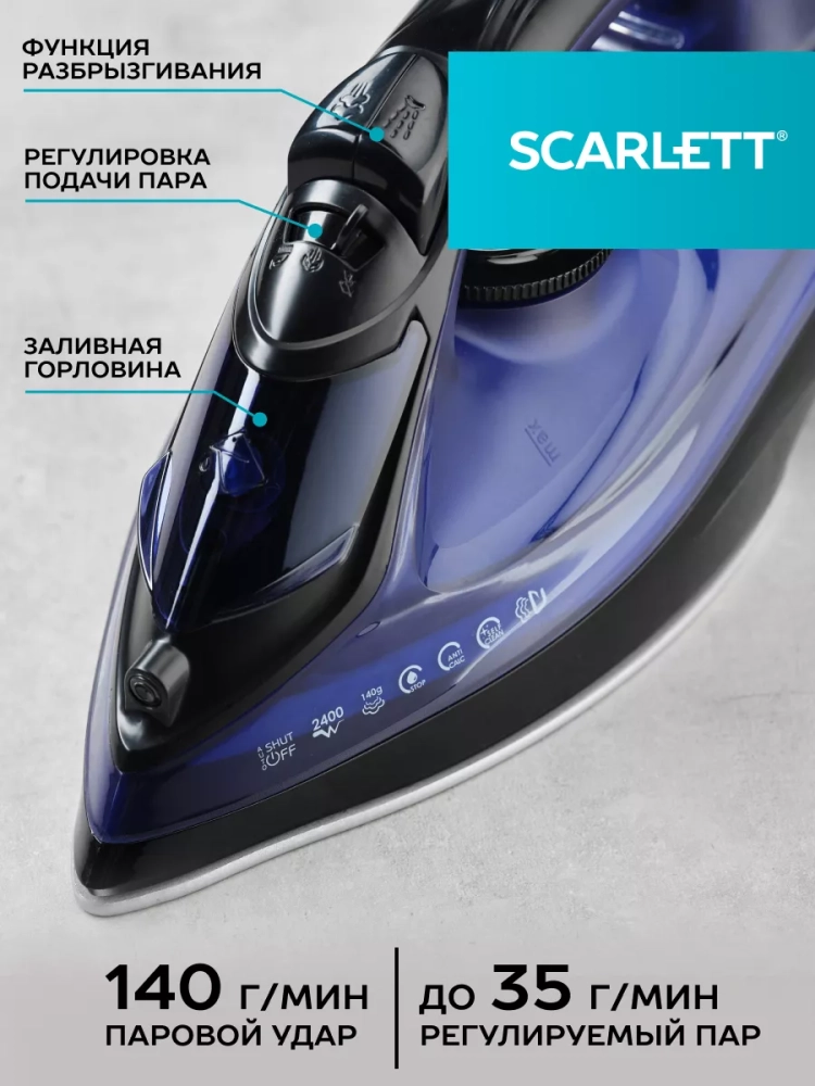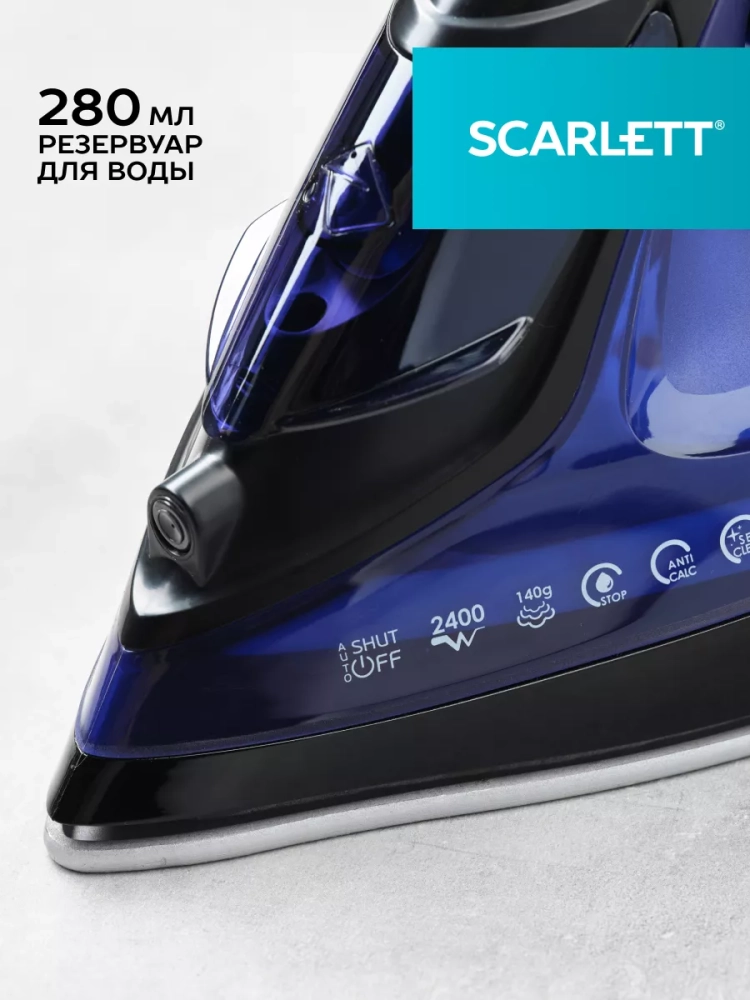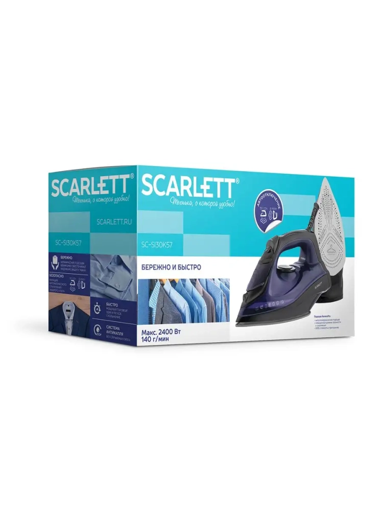 Утюг Scarlett SC-SI30K57 с пластиковым корпусом фиолетово-чёрного цвета снабжен идеально гладкой подошвой с керамическим покрытием KeramoPro, которая обеспечивает отличное скольжение и бережное отношение ко всем видам тканей. Прибор мощностью 2400 Вт легко скользит по поверхности любой ткани и может эффективно отпаривать вещи, постоянно выдавая до 35 граммов пара в минуту в режиме глажения с паром. В режиме парового удара создает 140 гр. пара в минуту, расправляя даже самые непослушные складки. Утюг снабжен автоотключением: выключится вовремя, если оставить его без присмотра в течение 30 сек в горизонтальном положении и 8 мин - в вертикальном. Есть функция вертикального отпаривания: это даёт возможность приводить в порядок пальто или костюмы даже на вешалке. Функция анти-капля позволяет избежать появления случайных капель на одежде. Система защиты от накипи совместно с функцией самоочистки существенно продлит срок службы утюга и убережет его от накипи. Оптимальный вес способствует разглаживанию неровностей без излишней нагрузки на руки. Удобный шнур длиной 180 мм - пластичный, гибкий, оснащен шаровым креплением, защищающим от перекручивания.