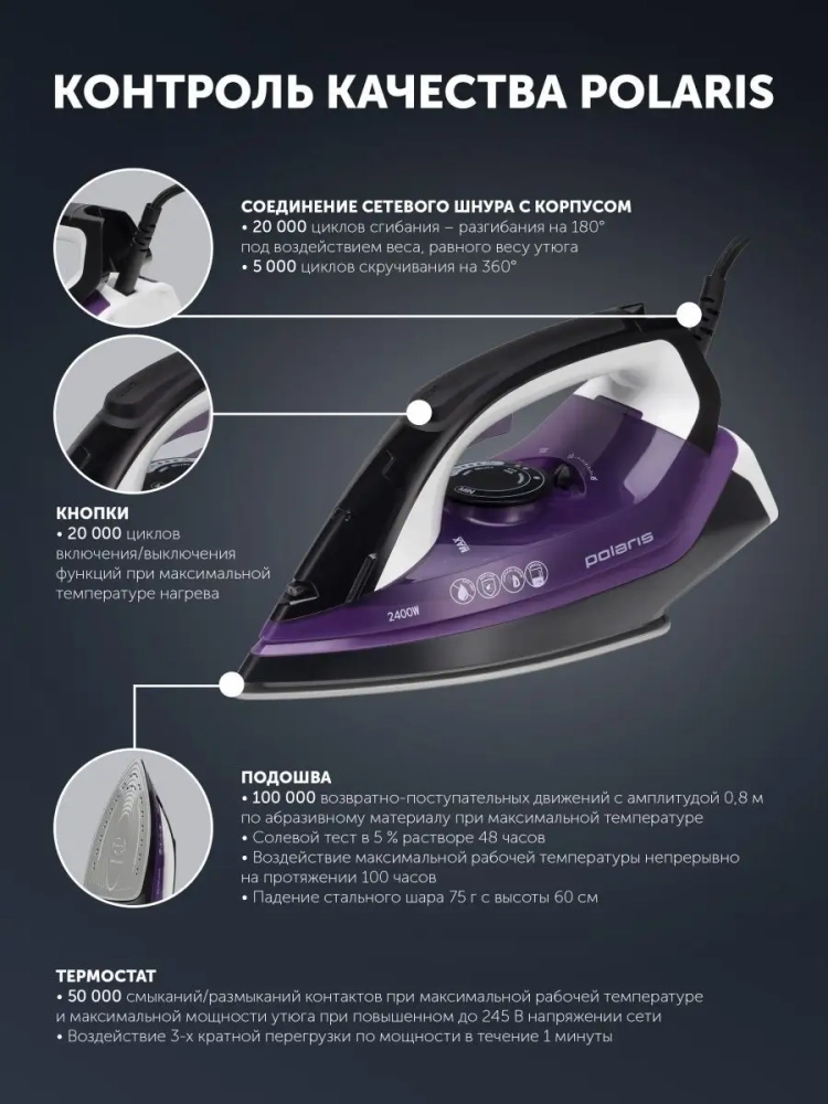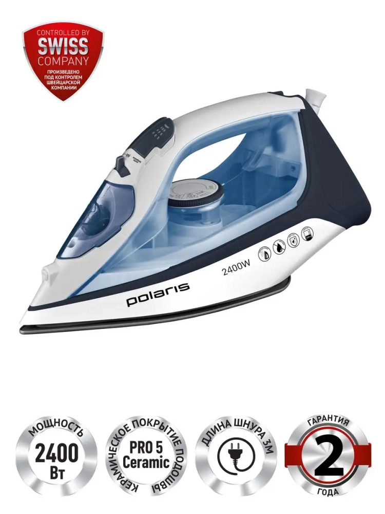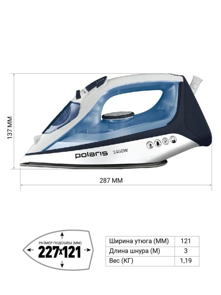 Длина сетевого шнура составляет 3 метра, что обеспечивает свободу движения при глажении. Мощность утюга составляет 2400 Вт, что гарантирует быстрое и эффективное разглаживание складок.