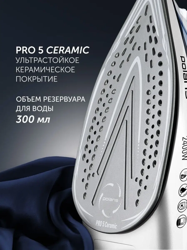 Ультрастойкое керамическое покрытие PRO 5 Ceramic обеспечивает равномерное распределение тепла и долгий срок службы утюга.