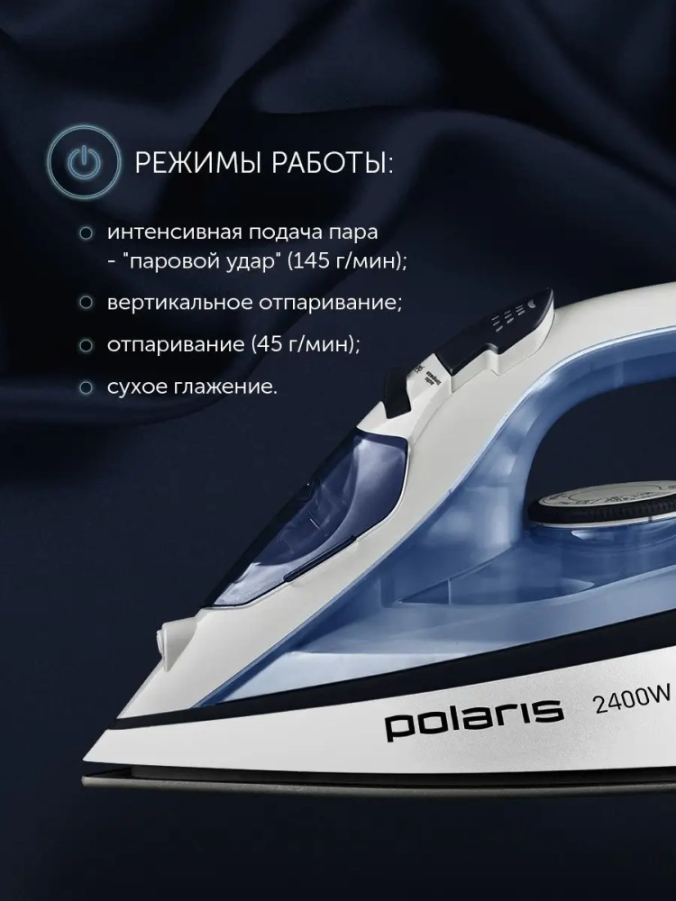 Утюг оснащен несколькими режимами работы, включая сухое глажение, отпаривание со скоростью 50 г/мин и интенсивную подачу пара с "паровым ударом" до 175 г/мин. Вертикальное отпаривание позволяет разглаживать одежду на вешалках или на манекенах.