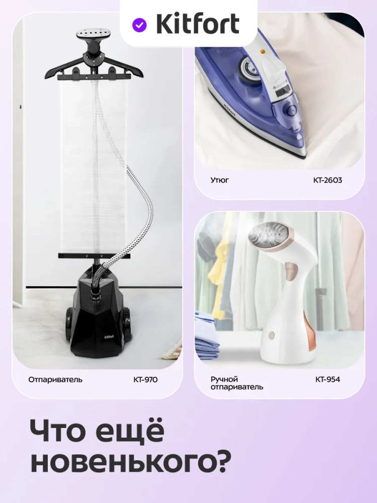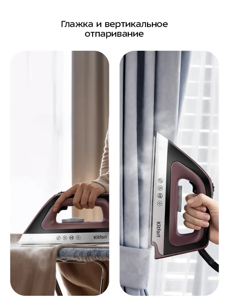 Керамическая подошва утюга хорошо скользит по поверхности одежды и легко очищается. Такой утюг не сделает затяжек на одежде и лишних складок. Паровую станцию КТ-9309 можно использовать для вертикального отпаривания. Вы можете отпарить занавески и портьеры (для этого их необязательно снимать), обивку мягкой мебели, матрасы. Также вы можете отпаривать одежду, висящую на плечиках, сушилке для белья или веревке. При этом вы не только разгладите складки, но и освежите вещи, а также продезинфицируете их, так как горячий пар убивает пылевых клещей и другие микроорганизмы.