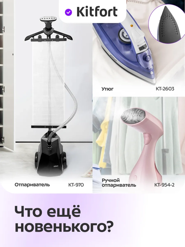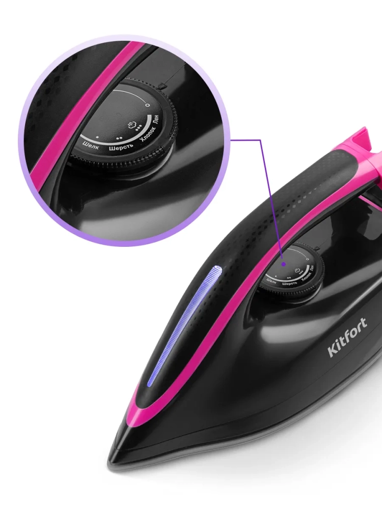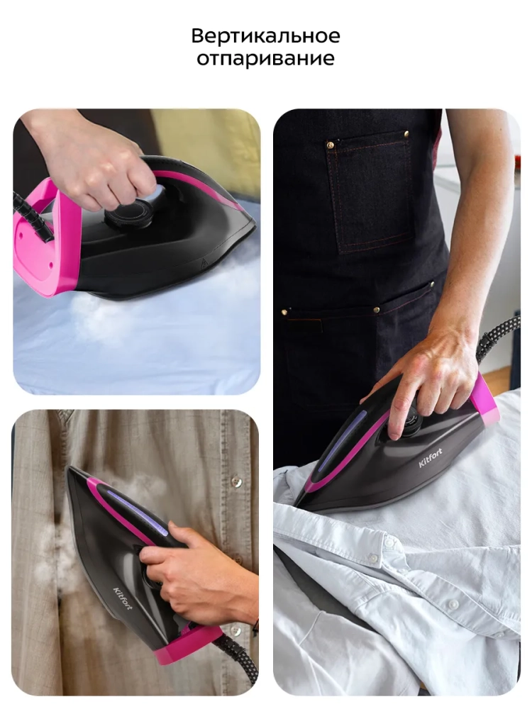 Керамическая подошва утюга хорошо скользит и легко очищается. Такой утюг не сделает затяжек на одежде и лишних складок. Паровую станцию КТ-9318 можно использовать для вертикального отпаривания. Вы можете отпарить занавески и портьеры (для этого их не обязательно снимать), обивку мягкой мебели, матрасы. Также вы можете отпаривать одежду, висящую на плечиках, сушилке для белья или веревке. При этом вы не только разгладите складки, но и освежите вещи, а также продезинфицируете их, так как горячий пар убивает пылевых клещей и другие микроорганизмы.