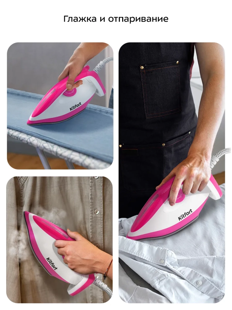 Керамическая подошва утюга хорошо скользит и легко очищается. Такой утюг не оставит затяжек на одежде и лишних складок. Паровую станцию КТ-9334 можно использовать для вертикального отпаривания. Вы можете отпарить занавески и портьеры (для этого их не обязательно снимать), обивку мягкой мебели, матрасы. Также вы можете отпаривать одежду, висящую на плечиках, сушилке для белья или веревке. При этом вы не только разгладите складки, но и освежите вещи, а также продезинфицируете их, так как горячий пар убивает пылевых клещей и другие микроорганизмы.