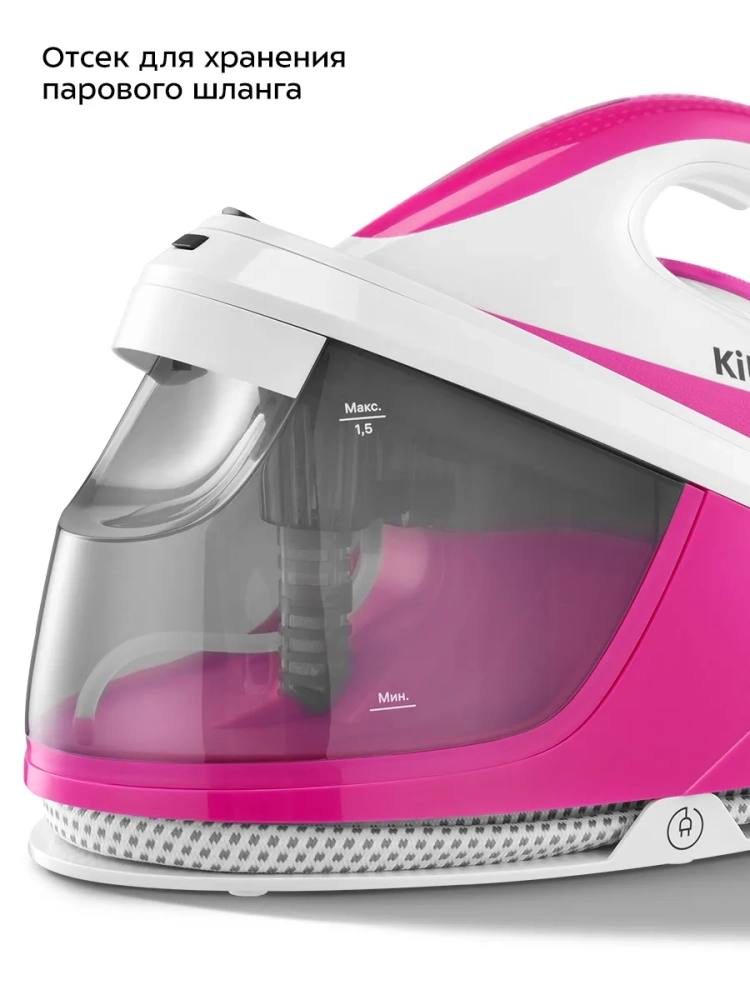 Отличительная особенность всех паровых станций — это большой резервуар для воды: емкость резервуара в паровой станции КТ-9334 составляет 1,5 л, тогда как в утюгах в среднем 0,3 л.