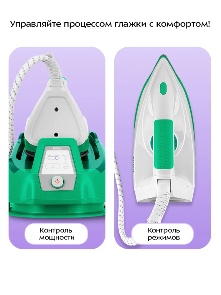 Паровая станция Kitfort KT-9342 — это современное устройство для глажки, заменяющее утюг и отпариватель. Прибор состоит из утюга для глажки и подставки для утюга с резервуаром для воды. Паровая станция позволяет гладить быстрее и эффективнее, чем утюг. Например, если на глажку рубашки и брюк обычным утюгом уходит около 15 минут, то при помощи паровой станции вы справитесь за 5 минут. Благодаря силе пара, создаваемого с помощью паровой станции, можно эффективно гладить постельное белье и полотенца, сложенные в несколько слоев.