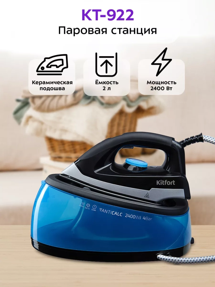 Паровая станция Kitfort KT-922 - это современное устройство для глажки, заменяющее утюг и отпариватель. Прибор состоит из утюга для проглаживания, подставки для утюга с резервуаром для воды (корпуса) и шланга. Устройство обеспечивает непрерывную подачу пара. Интенсивность пара можно регулировать. Паровая станция позволяет гладить быстрее и эффективнее, чем утюг. Например, если на глажку рубашки и брюк обычным утюгом уходит около 15 минут, то при помощи паровой станции вы справитесь за 5 минут. Благодаря силе пара с помощью паровой станции можно эффективно гладить постельное белье и полотенца, сложенные в несколько слоев. Прибор оснащен функцией вертикального отпаривания. У КТ-922 корпус небольшой и не занимает много места. Сам утюг имеет небольшой вес и керамическую подошву TitaniumSlide. Керамическая подошва хорошо скользит и легко очищается. Такой утюг не сделает на одежде лишних складок. Кроме глажки и отпаривания паровая станция обрабатывает вещи мощной струей горячего пара, проводя таким образом чистку и дезинфекцию. Вы можете отпарить занавески и портьеры (для этого их не обязательно снимать), обивку мягкой мебели, матрасы, кровати. Также вы можете отпаривать одежду, висящую на плечиках, на сушилке для белья или на веревке. При этом вы не только разгладите складки, но и освежите вещи, а также продезинфицируете их, так как горячий пар хорошо убивает пылевых клещей и другие микроорганизмы. Паровая станция позволяет прогладить и вещи, которые обычно не гладят, например, пышные платья со сложной структурой, шубы и дубленки. Также с ее помощью можно готовить к сезону вещи, у которых при хранении появился затхлый запах — паровая станция эту проблему решает без всякой стирки. Если вы находились в прокуренном помещении, и одежда пропахла табаком, то с помощью паровой станции можно быстро убрать запах и освежить ее.