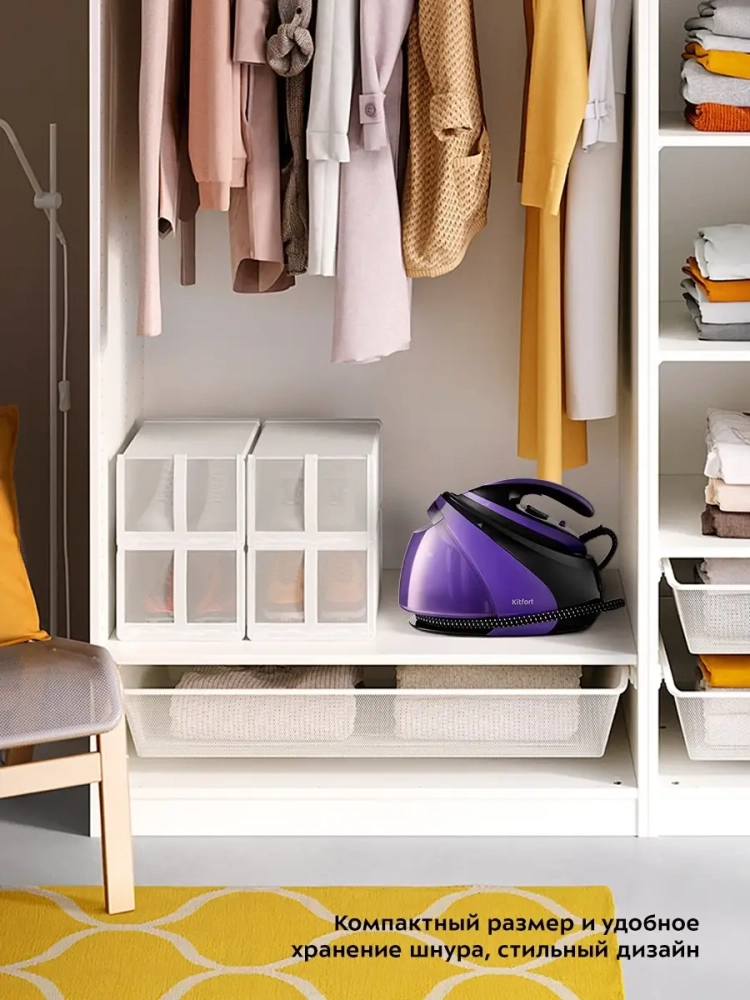 Паровая станция Kitfort KT-980 — это современное устройство для глажки, заменяющее утюг и отпариватель. Прибор состоит из утюга для глажки и подставки для утюга (корпуса) со съемным резервуаром для воды. Устройство обеспечивает непрерывную подачу пара. Интенсивность пара можно регулировать. Паровая станция позволяет гладить быстрее и эффективнее, чем утюг. Например, если на глажку рубашки и брюк обычным утюгом уходит около 15 минут, то при помощи паровой станции вы справитесь за 5 минут. Благодаря силе пара, создаваемого с помощью паровой станции, можно эффективно гладить постельное белье и полотенца, сложенные в несколько слоев. Паровую станцию КТ-980 можно использовать для вертикального отпаривания.