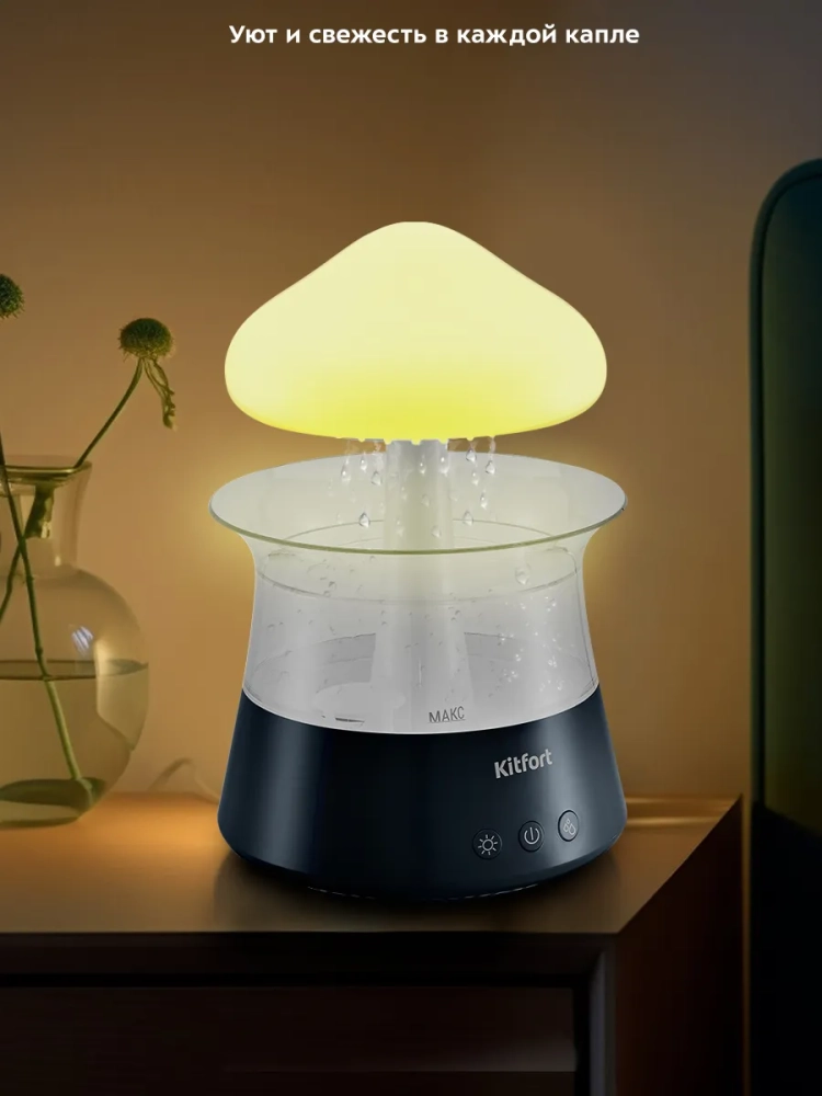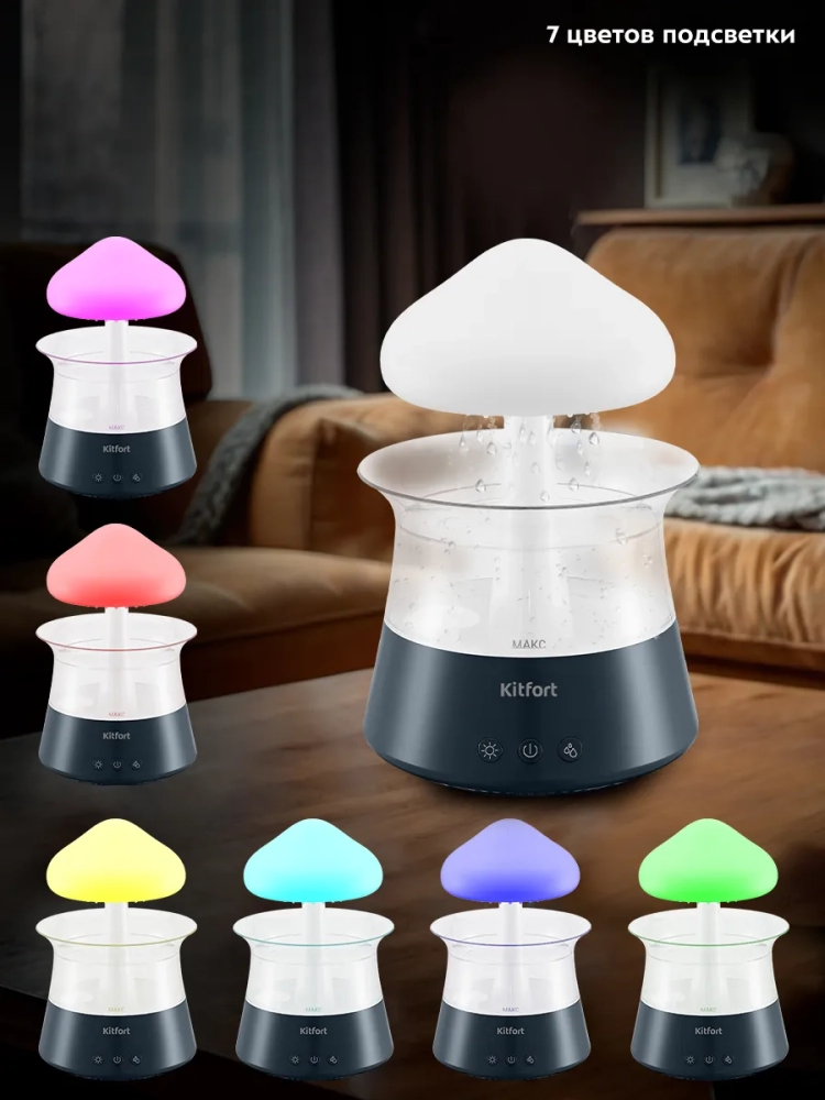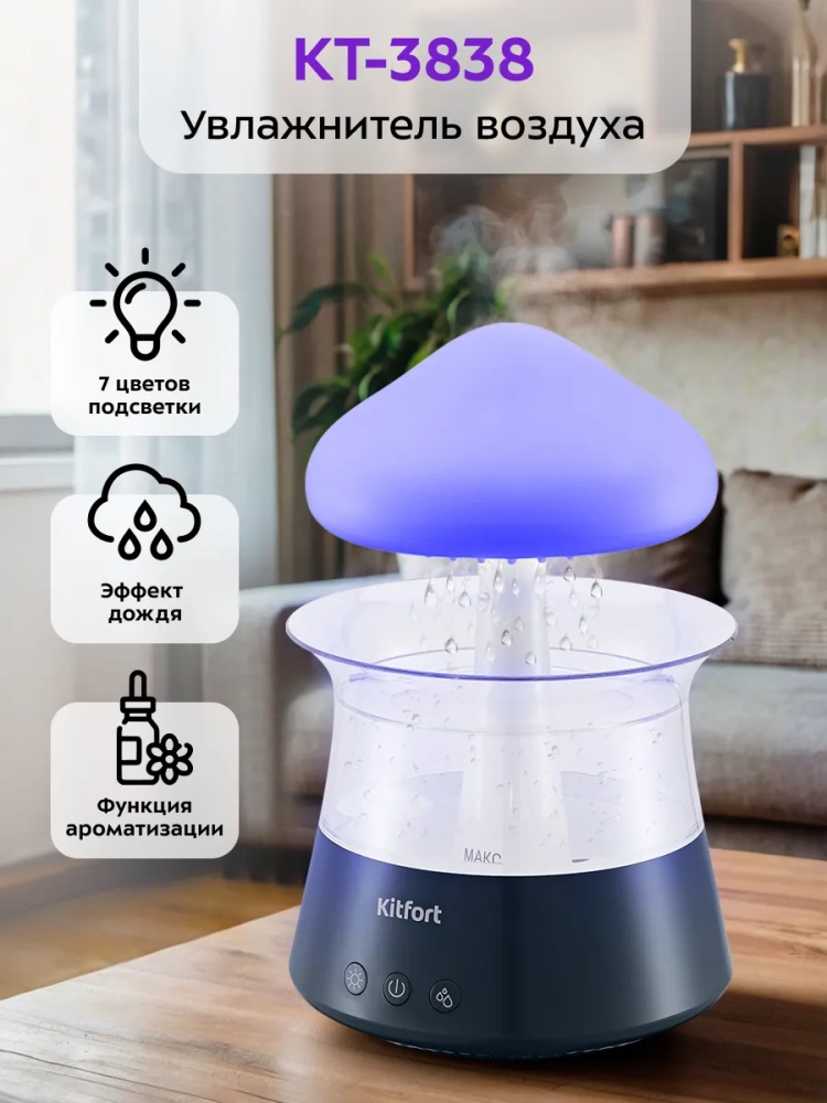 Особенностью увлажнителя-ароматизатора КТ-3838 является эффект дождя, который возникает за счет подачи воды сверху вниз насосом в корпусе устройства. Вода по каплям выходит из отверстий в верхней части устройства, выполненной в виде облака, создавая таким образом визуальный и шумовой эффект дождевых капель. Звук дождя успокаивающе действует на нервную систему и помогает быстрее заснуть. При желании данный эффект можно отключить. Излучатель, создающий туман, и водяной насос, подающий воду, могут работать одновременно или по отдельности. Кроме того, вы можете использовать устройство как ночник, включив подсветку с плавной сменой семи цветов или выбрав один цвет подсветки, который будет гореть непрерывно или мягко затухать и загораться снова.