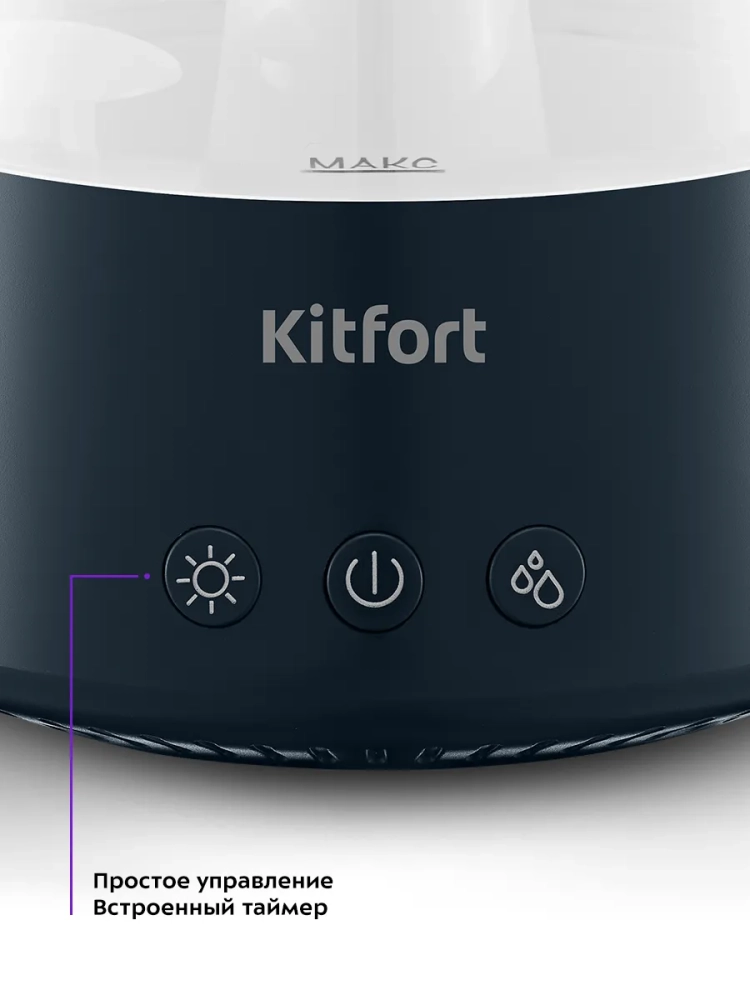 У устройства простое и легкое управление тремя кнопками. Есть возможность включить таймер на 5 часов. По истечении установленного времени или при отсутствии воды увлажнитель-ароматизатор автоматически отключится.