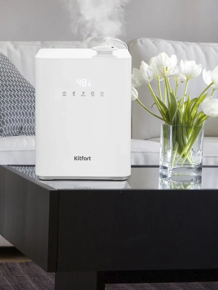 Ультразвуковой увлажнитель воздуха Kitfort KT-2809 увлажняет воздух в помещении, и ионизирует его, создавая хороший микроклимат для проживания людей. Он оборудован встроенным гигрометром, поэтому может поддерживать заданный вами уровень влажности. В основание корпуса увлажнителя встроен PTC-нагреватель, который нагревает воду примерно до 50 C и из увлажнителя выходит теплый туман. В резервуаре увлажнителя расположен керамический фильтр, благодаря которому вода очищается от примесей и становится мягче за счет снижения в ней концентрации минеральных веществ. С помощью кнопок на передней панели можно установить целевую влажность воздуха 30-90 процентов с шагом 5, время таймера - от 1 до 12 часов и интенсивность тумана 1, 2 или 3. КТ-2809 простой в эксплуатации и обслуживании, отличается высокой надежностью в работе. Может использоваться в помещениях и квартирах, площадь которых не превышает 15-20 м2.
