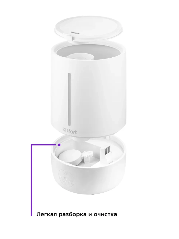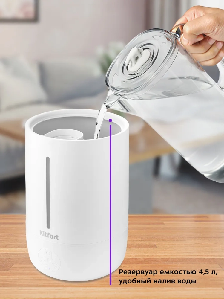 Техника Kitfort отличается низким уровнем шума, что делает ее идеальной для использования в ночное время. Увлажнитель воздуха оснащен функцией таймера, позволяющей настроить автоматическое отключение через заданное количество часов. Это обеспечивает дополнительное удобство и экономию электроэнергии. Подсветка резервуара добавляет эстетическую привлекательность и позволяет контролировать уровень воды.