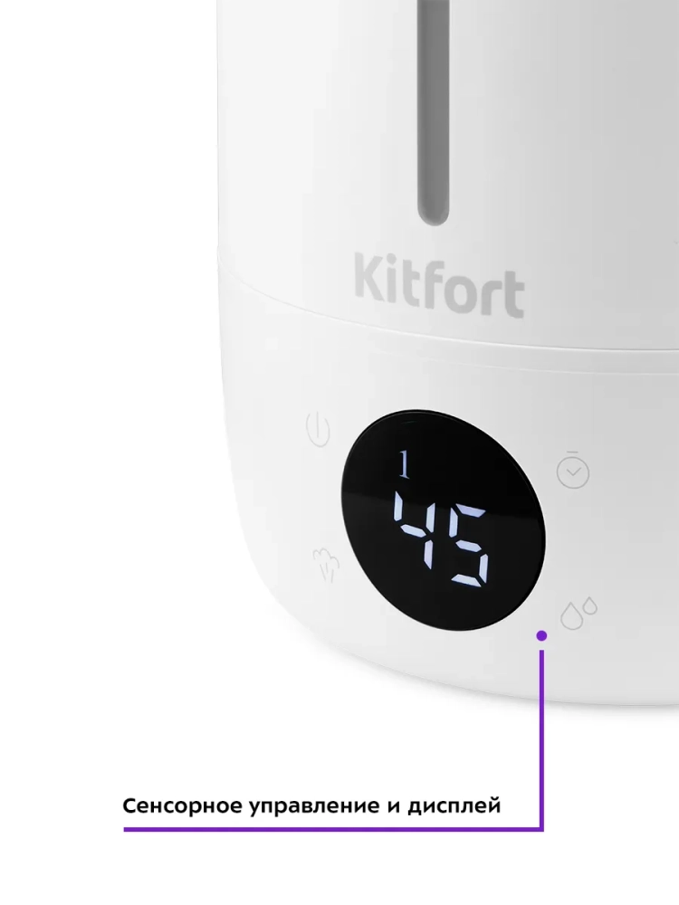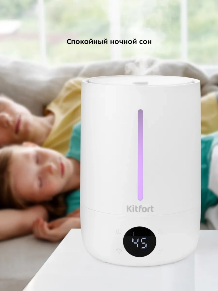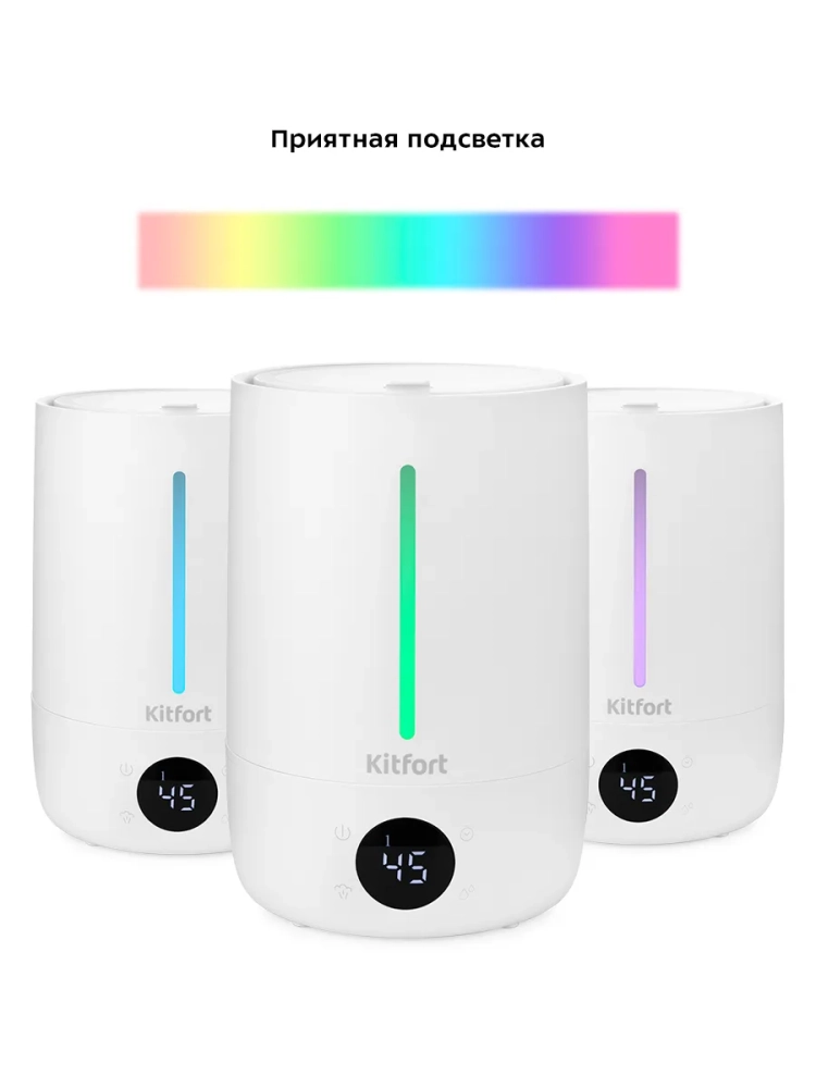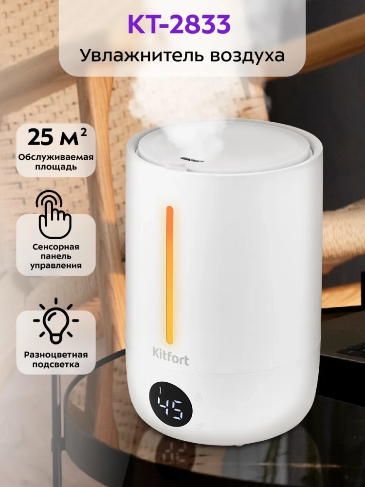 Ультразвуковой увлажнитель воздуха Kitfort KT-2833 увлажняет воздух в помещении, создавая хороший микроклимат для проживания людей. КТ-2833 простой в эксплуатации и обслуживании, отличается высокой надежностью в работе. Может использоваться в помещениях, площадь которых не превышает 25 кв. м. Данный увлажнитель компактный, прост как в использовании, так и в обслуживании. Ультразвуковые увлажнители считаются наиболее эффективными из существующих увлажнителей воздуха. Принцип работы такого увлажнителя прост. Внутри него стоит пьезокерамический излучатель, погруженный в воду, который с помощью ультразвуковых колебаний выбивает с поверхности воды мельчайшие капельки воды, создавая водяной туман. Этот туман выдувается наружу небольшим вентилятором, а затем разносится по объему помещения естественными воздушными потоками. Частицы тумана мелкие, они обладают большой суммарной поверхностью, а потому быстро испаряются, что приводит к повышению относительной влажности воздуха.