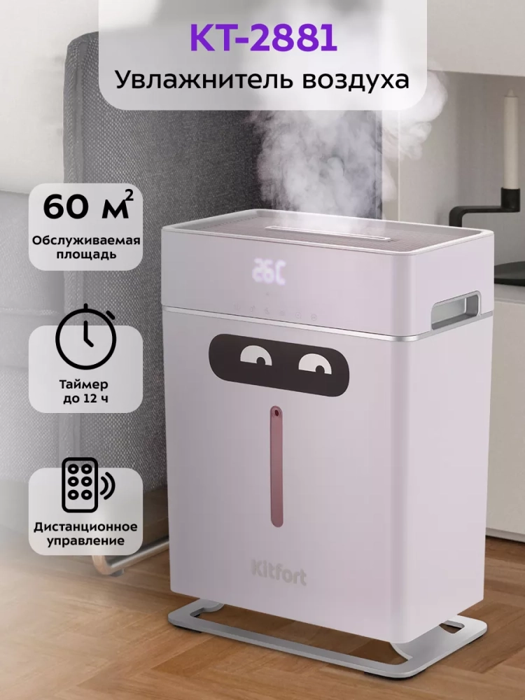 Ультразвуковой увлажнитель воздуха Kitfort KT-2881 увлажняет воздух в помещении, создавая хороший микроклимат для проживания людей. Увлажнитель Китфорт КТ-2881 простой в эксплуатации и обслуживании, отличается высокой надежностью работы и наличием двух излучателей, благодаря которым увлажнитель может создавать вдвое больше тумана, поэтому эффективность увлажнения возрастает. Может использоваться в помещениях, площадь которых не превышает 60 м². Напольная конструкция обеспечивает удобство размещения устройства в помещении.