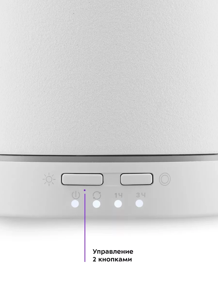 У устройства простое и легкое управление двумя кнопками. Увлажнитель имеет два режима подачи тумана: непрерывный и импульсный. В импульсном режиме подача тумана будет циклически включаться на 15 секунд, затем выключаться на 15 секунд. Есть возможность включить таймер на 1 или 3 часа, в течение этого времени устройство будет работать в непрерывном режиме. Можно включить подсветку с плавной сменой цветов или выбрать один цвет подсветки. Устройство можно использовать как ночник, не включая подачу тумана.