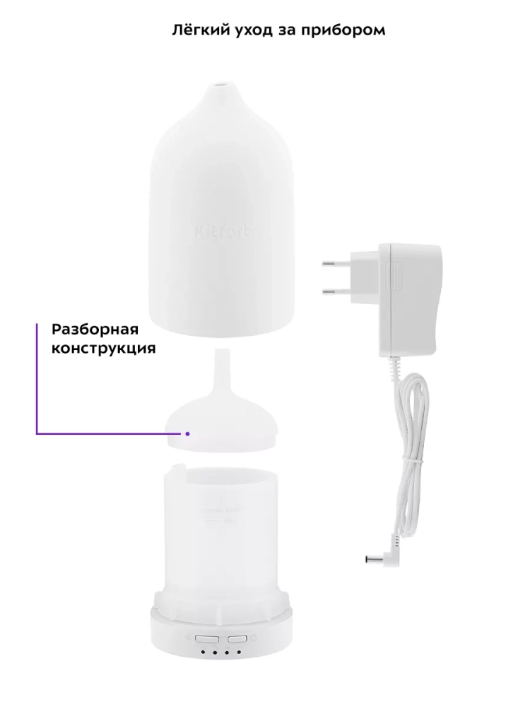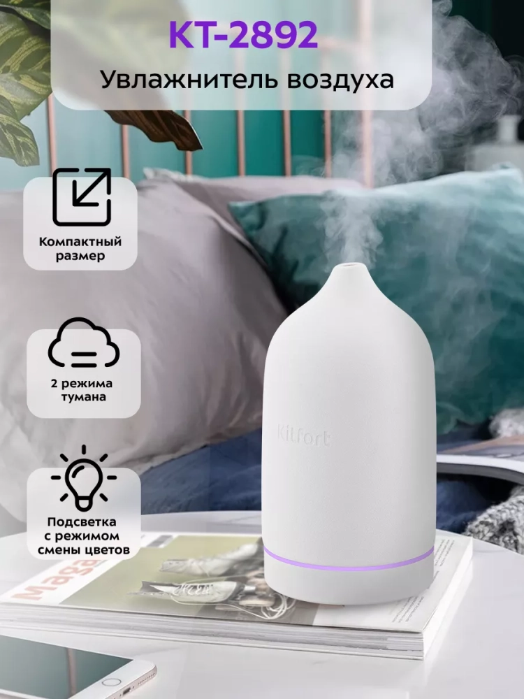 Увлажнитель-ароматизатор воздуха Kitfort КТ-2892 — компактный прибор, который создаст благоприятный микроклимат рядом с вами. Добавьте в резервуар для воды несколько капель эфирного масла, чтобы во время работы увлажнителя ароматическое вещество испарялось и вместе с туманом выдувалось наружу потоком воздуха, создавая вокруг приятный и ненавязчивый аромат. Он будет увлажнять воздух вокруг области его размещения, поэтому можно комфортно находиться на рабочем месте, крепко спать или заниматься любыми другими делами, пока рядом с вами находится увлажнитель воздуха.