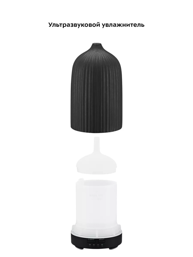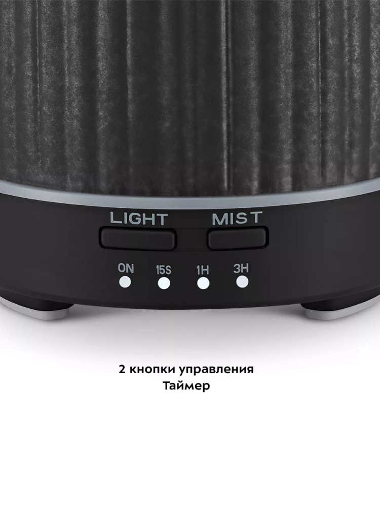 У устройства простое и легкое управление двумя кнопками. Увлажнитель имеет два режима подачи тумана: непрерывный и импульсный. В импульсном режиме подача тумана будет циклически включаться на 15 секунд, затем выключаться на 15 секунд. Есть возможность включить таймер на 1 или 3 часа, в течение этого времени устройство будет работать в непрерывном режиме. Можно включить подсветку с плавной сменой цветов или выбрать один цвет подсветки. Устройство можно использовать как ночник, не включая подачу тумана.