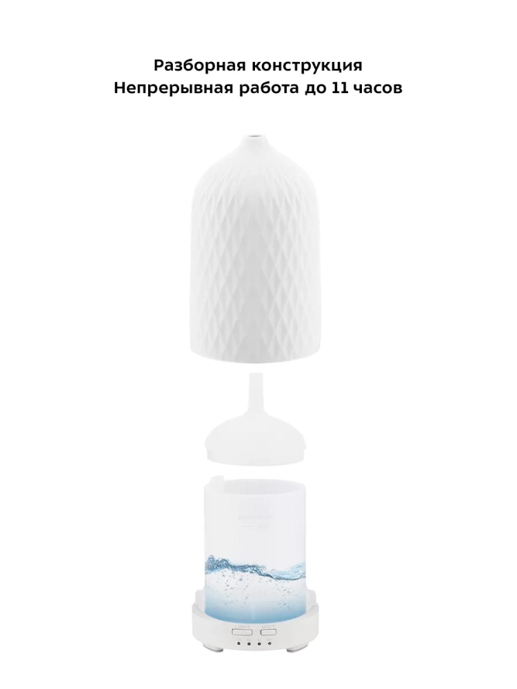 У устройства простое и легкое управление двумя кнопками. Увлажнитель имеет два режима подачи тумана: непрерывный и импульсный. В импульсном режиме подача тумана будет циклически включаться на 15 секунд, затем выключаться на 15 секунд. Есть возможность включить таймер на 1 или 3 часа, в течение этого времени устройство будет работать в непрерывном режиме. Можно включить подсветку с плавной сменой цветов или выбрать один цвет подсветки. Устройство можно использовать как ночник, не включая подачу тумана.