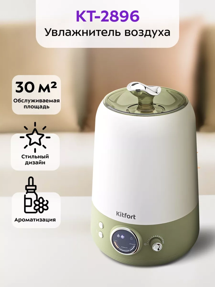 Ультразвуковой увлажнитель воздуха Kitfort KT-2896 увлажняет воздух в помещении, создавая хороший микроклимат для проживания людей.