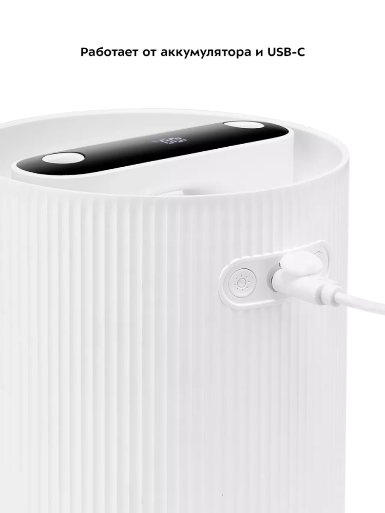 Встроенный аккумулятор позволяет пользоваться увлажнителем не только рядом с источником питания. Но если вы хотите включить увлажнитель на длительное время, вы можете подключить его к источнику питания при помощи шнура USB Type-C. На дисплее отображается уровень заряда аккумулятора.