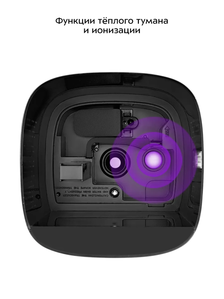 В основание корпуса увлажнителя встроен PTC-нагреватель, который нагревает воду в основание примерно до 50 °C, и из увлажнителя выходит теплый туман. Теплый туман быстрее увлажняет воздух в помещении.
