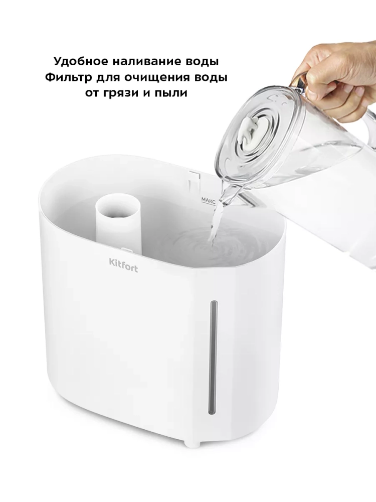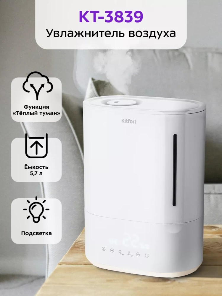 Ультразвуковой увлажнитель воздуха Kitfort KT-3839 увлажняет воздух в помещении, создавая хороший микроклимат для проживания людей. Увлажнитель КТ-3839 может использоваться в помещениях, площадь которых не превышает 30 м².