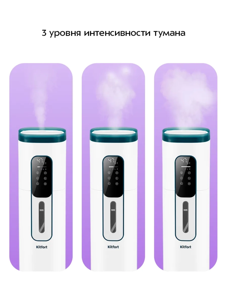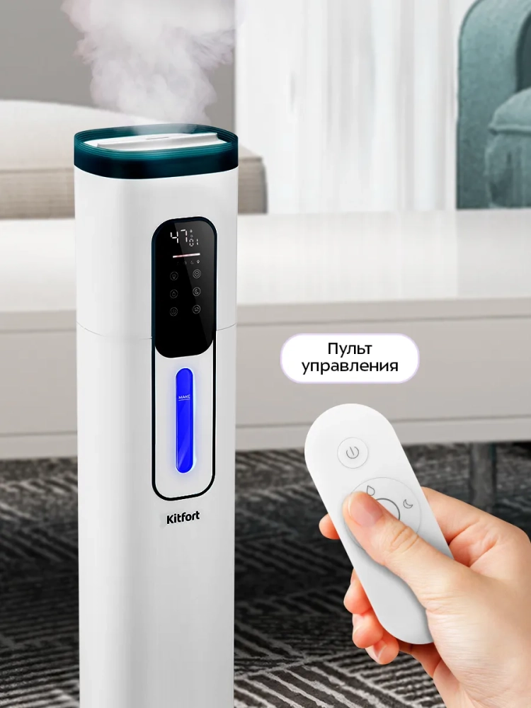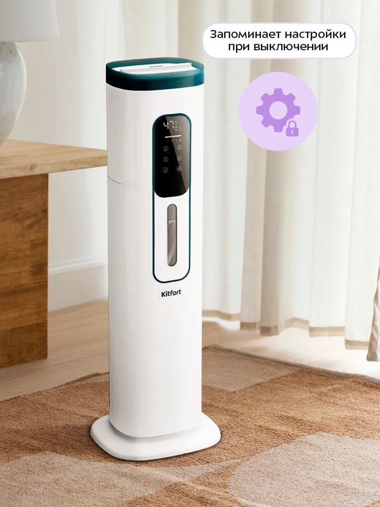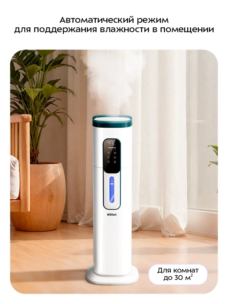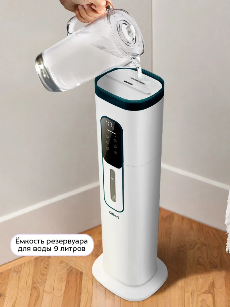 Ультразвуковой увлажнитель воздуха Kitfort KT-3859 увлажняет воздух в помещении, поддерживая оптимальный микроклимат. Увлажнитель КТ-3859 прост в эксплуатации и обслуживании, отличается высокой надежностью работы. Может использоваться в помещениях, площадь которых не превышает 30 м². Напольная конструкция обеспечивает удобство размещения устройства. Благодаря большому объему резервуара для воды увлажнитель может работать непрерывно 25–26 часов при максимальной интенсивности испарения.