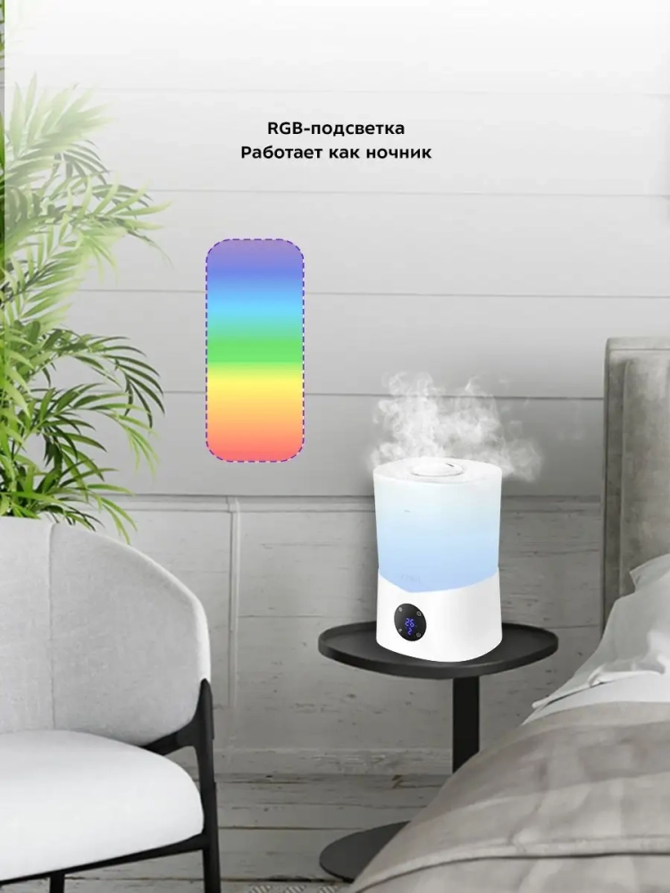 Увлажнитель оснащен RGB-подсветкой (RGB – аббревиатура английских слов red, green, blue – красный, зелёный, синий), в конструкции которой используются светодиоды трех цветов. Эти три цвета являются базовыми, и на их смешении формируется другие цвета. Устройство с подсветкой можно использовать без включения тумана, как ночник.
