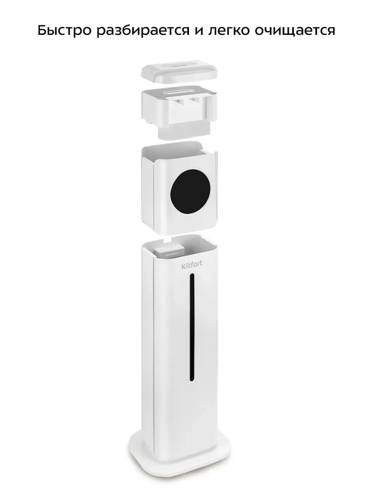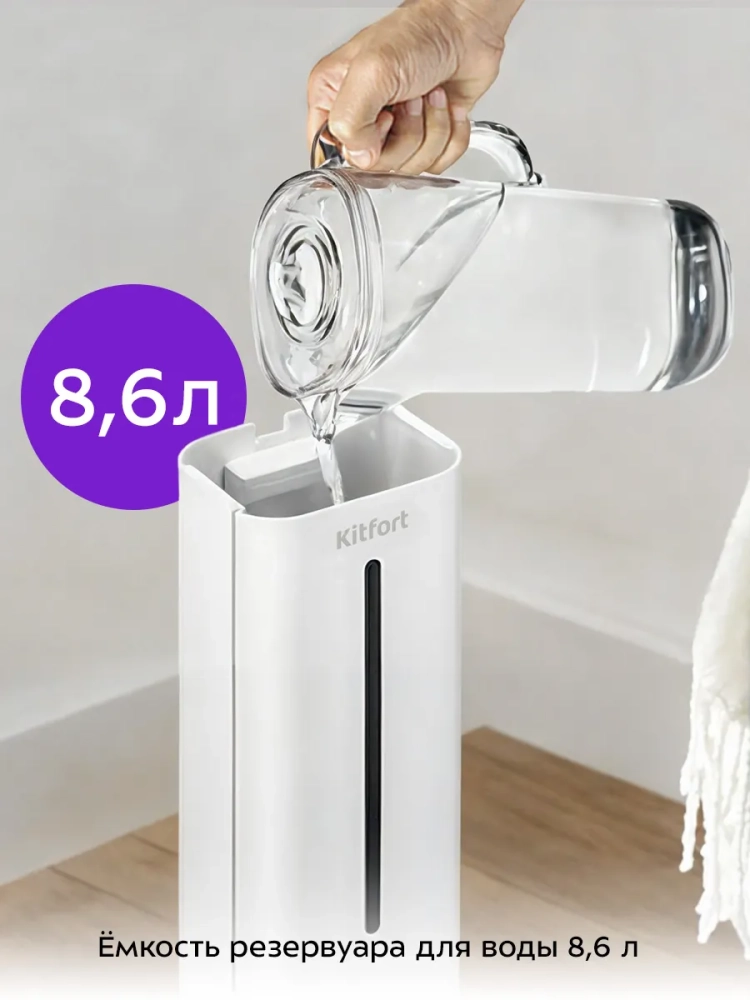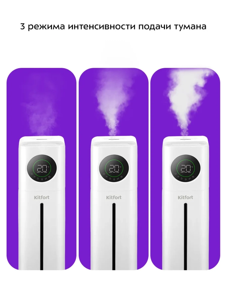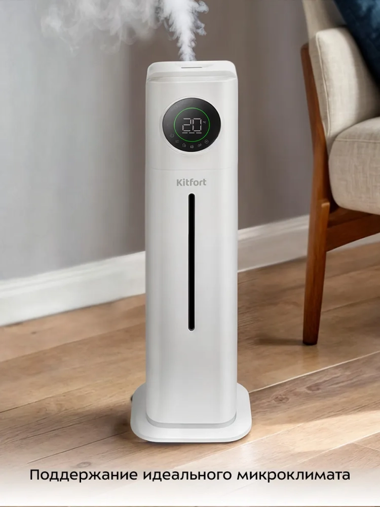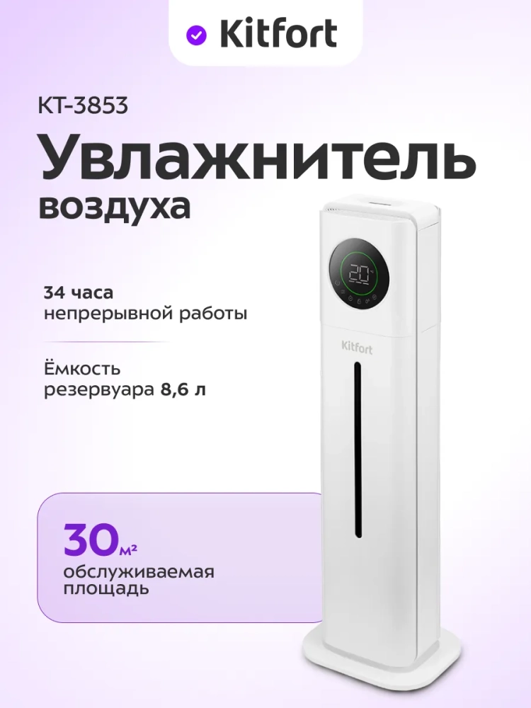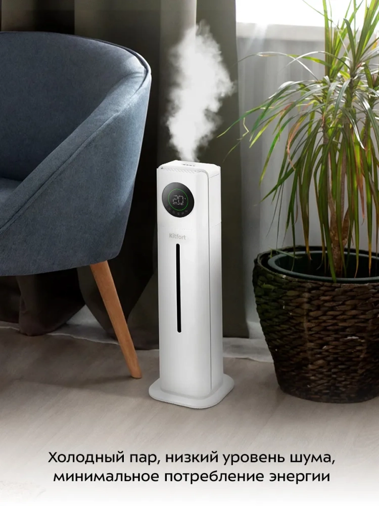 Ультразвуковой увлажнитель воздуха Kitfort KT-3853 увлажняет воздух в помещении, создавая хороший микроклимат для проживания людей. Увлажнитель КТ-3853 – простой в эксплуатации и обслуживании прибор, который отличается высоким качеством работы. Может использоваться в помещениях, площадь которых не превышает 30 м². Напольная конструкция обеспечивает удобство размещения устройства в помещении. Благодаря большому объему резервуара для воды увлажнитель может работать непрерывно 34 часа на максимальной мощности.
