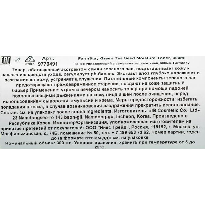 Увлажняющий тонер FarmStay, с семенами зелёного чая, 300 мл