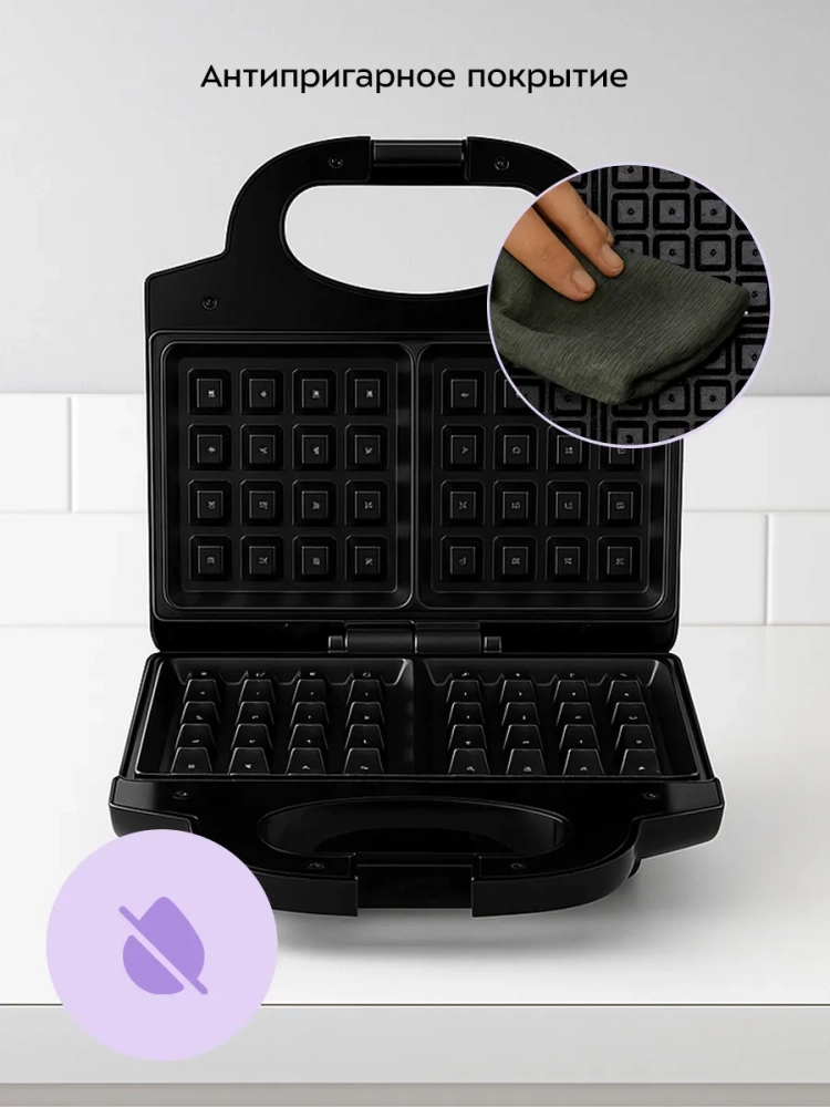 Вафельница для бельгийских вафель КТ-4684 от Kitfort — это идеальное кухонное электро решение для любителей домашней выпечки. С её помощью вы сможете приготовить две аппетитные бельгийские вафли одновременно, что делает её незаменимой на кухне. Антипригарное покрытие панелей обеспечивает лёгкость в использовании и уходе, предотвращая прилипание теста и позволяя готовить с минимальным количеством масла. Это особенно важно для тех, кто следит за своим здоровьем и предпочитает низкокалорийные блюда. Эта электровафельница оснащена индикаторами питания и нагрева, что позволяет контролировать процесс приготовления без лишних усилий. Термостат поддерживает оптимальную температуру панелей, обеспечивая равномерное пропекание вафель. Встроенный фиксатор удерживает крышку в закрытом состоянии, что удобно при хранении или транспортировке устройства. Вафельница работает от сети с напряжением 220–240 В и частотой 50/60 Гц. Её мощность составляет 750 Вт, что гарантирует быстрое приготовление вкусных вафель к завтраку или десерту. Длина шнура составляет 0,7 м — достаточно для комфортного использования на кухне любого размера. Размеры панели составляют 226 х 126 мм, а габариты самого устройства — 220 х 230 х 88 мм. Это компактная бытовая техника для кухни не займет много места на столешнице или в шкафу. Если вы ищете всё для кухни или хотите обновить свою коллекцию техники для кухни новыми устройствами высокого качества — эта модель станет отличным выбором! Она идеально впишется в интерьер любой современной кухни благодаря своему стильному дизайну.