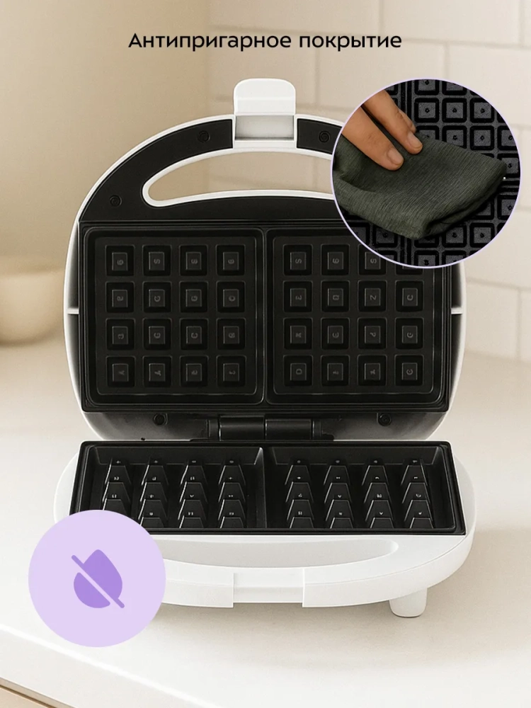 Вафельница для бельгийских вафель КТ-4686 - 750 Вт от Kitfort — это идеальное бытовое кухонное решение для любителей домашней выпечки. С помощью этой электровафельницы вы сможете приготовить две аппетитные бельгийские вафли одновременно, что значительно экономит ваше время. Антипригарное покрытие панелей предотвращает прилипание теста, позволяя готовить с минимальным количеством масла и облегчая процесс чистки после использования. Эта вафельница оснащена индикаторами питания и нагрева, которые помогут вам контролировать процесс приготовления. Термостат поддерживает оптимальную температуру панелей, обеспечивая равномерное пропекание каждой вафли. Удобный фиксатор позволяет удерживать крышку в закрытом состоянии, что делает хранение и транспортировку устройства более удобными. Работает прибор от сети с напряжением ~220–240 В и частотой 50/60 Гц. Мощность составляет 750 Вт, что обеспечивает быстрое нагревание и приготовление ваших любимых лакомств. Длина шнура составляет 0,7 м — достаточно для комфортного размещения на кухне. Размеры панели составляют 216 х 120 мм, а габариты самого устройства — 235 х 210 х 77 мм. Это компактная модель легко впишется в интерьер любой кухни без лишних хлопот по размещению. Класс защиты от поражения электрическим током I гарантирует безопасность при использовании прибора в домашних условиях. Если вы ищете надежную электровафельницу для регулярного использования или хотите порадовать близких вкусными десертами на завтрак или полдник — эта модель китфорт станет отличным выбором.
