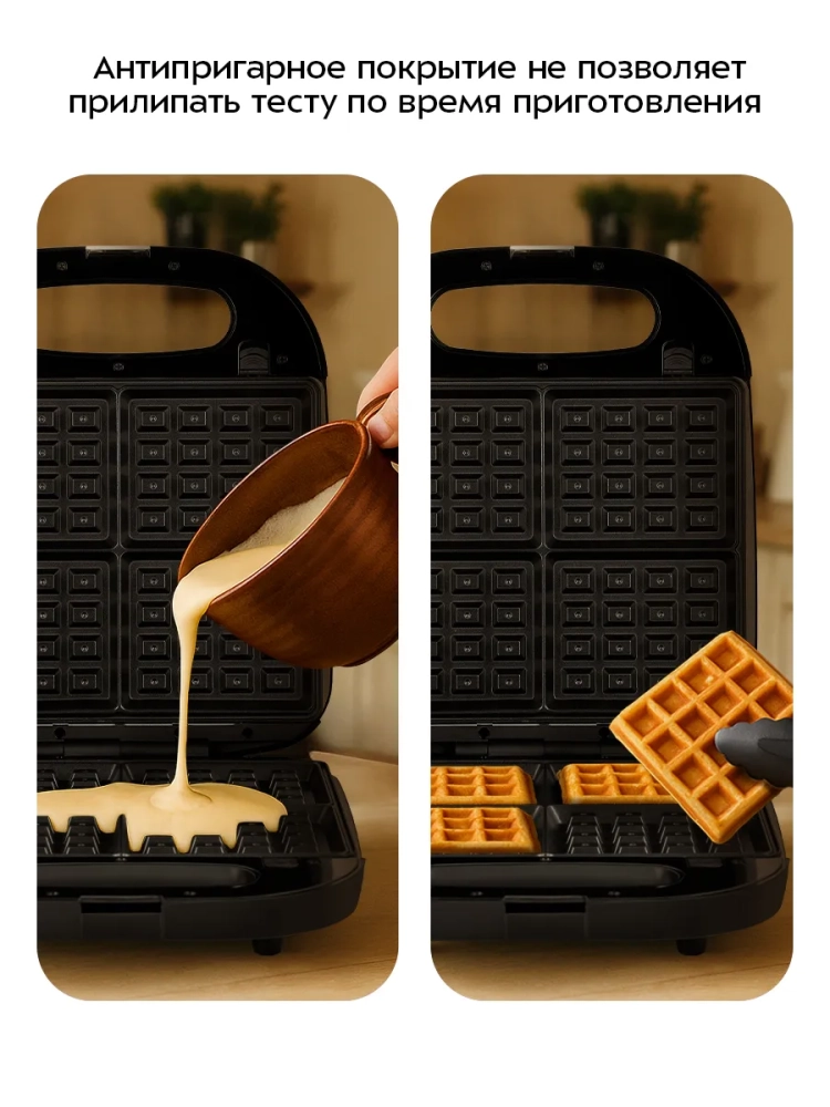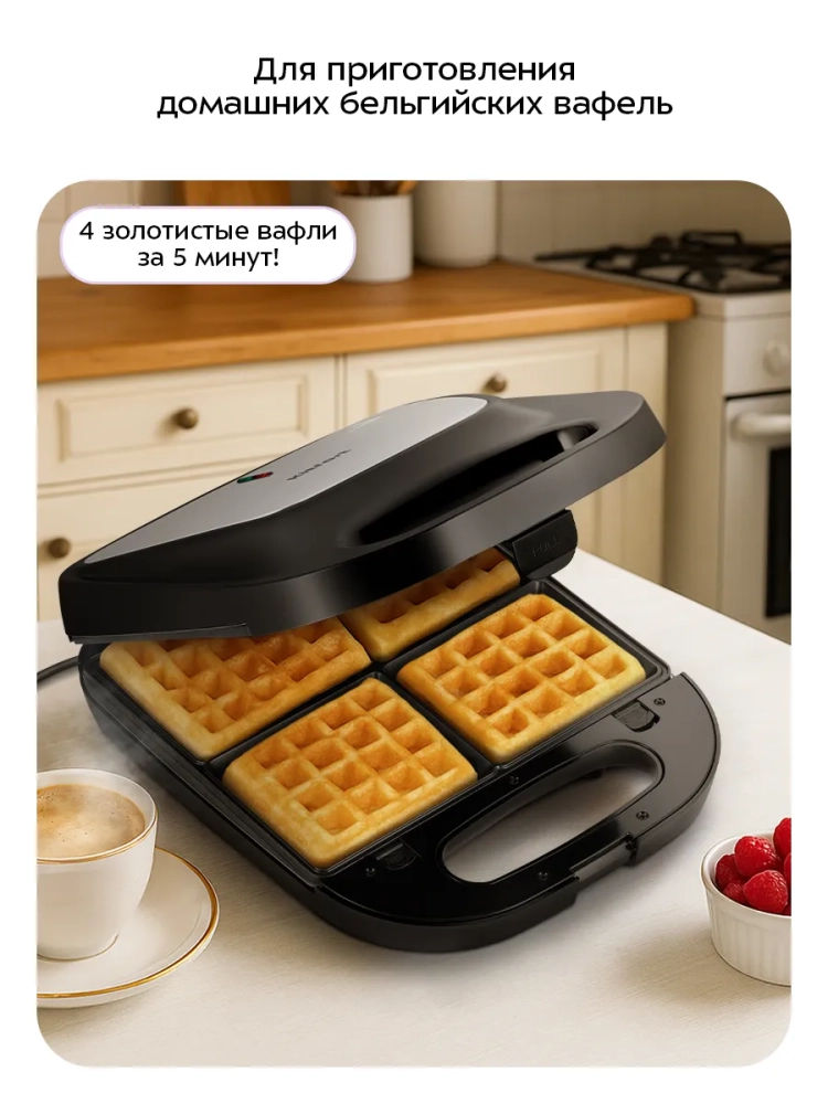 Вафельница для бельгийских вафель КТ-4688 - это идеальное решение для любителей домашней выпечки. С помощью этой электровафельницы вы сможете приготовить 4 аппетитные бельгийские вафли одновременно. Антипригарное покрытие панелей предотвращает прилипание теста, что позволяет готовить с минимальным количеством масла и облегчает процесс чистки. Съемные панели можно легко мыть под проточной водой, что делает уход за устройством простым и удобным.