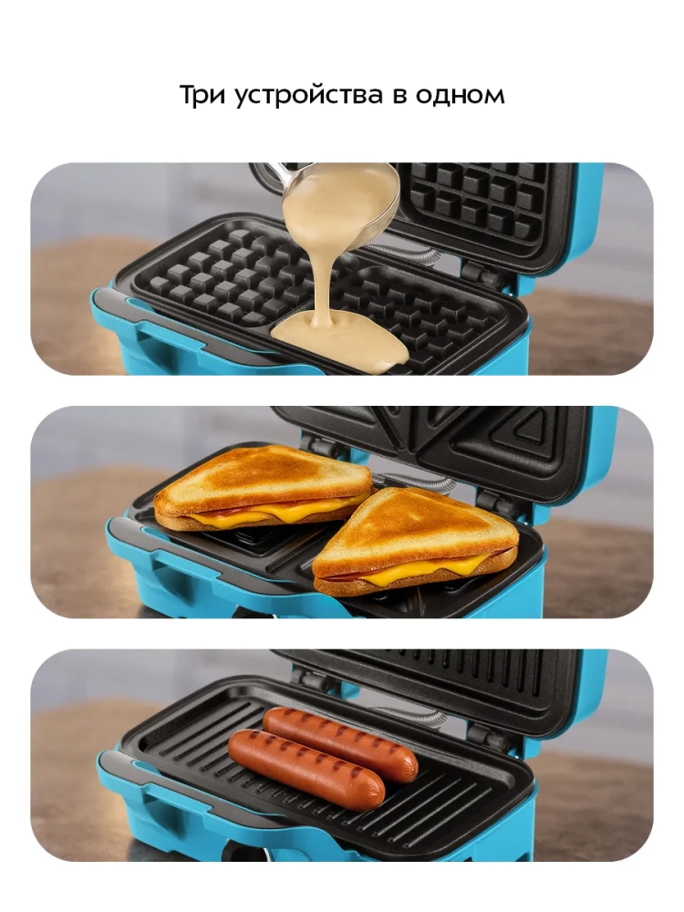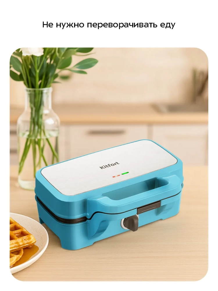 Вафельница для бельгийских вафель КТ-5602 от Kitfort — это многофункциональный мощный электрический прибор, который станет незаменимым помощником на вашей кухне. Эта электровафельница позволяет готовить не только вкусные бельгийские вафли, но и разнообразные бутерброды в бутерброднице, панини и сэндвичи в сендвичнице. Благодаря трем парам съемных панелей, вы сможете легко переключаться между различными режимами приготовления: панели для вафель, бутербродов, гриля и подобной выпечки. Электрический гаджет оснащен антипригарным покрытием на панелях, что обеспечивает минимальное использование масла при готовке и облегчает процесс чистки. Высокая температура нагрева способствует быстрому приготовлению блюд с обеих сторон благодаря закрытой конструкции крышки. Это позволяет вам не беспокоиться о переворачивании продуктов в процессе приготовления. Бытовой прибор имеет регулятор температуры и индикаторы питания и нагрева для удобства использования. Держатели шнура на задней части корпуса обеспечивают компактное хранение устройства после использования. Зажим на ручке надежно фиксирует крышку в закрытом состоянии во время транспортировки или хранения. Сэндвичница работает от сети с напряжением 220–240 В при частоте 50/60 Гц и мощностью 1200 Вт. Размеры панели составляют 278 х 145 мм, а самого устройства — 287 х 230 x 118 мм. Длина шнура составляет всего лишь 0,7 м. Этот кухонный гаджет идеально подходит для тех, кто ценит многофункциональность техники в быту! С помощью этой техники вы сможете радовать себя и близких разнообразными блюдами каждый день.